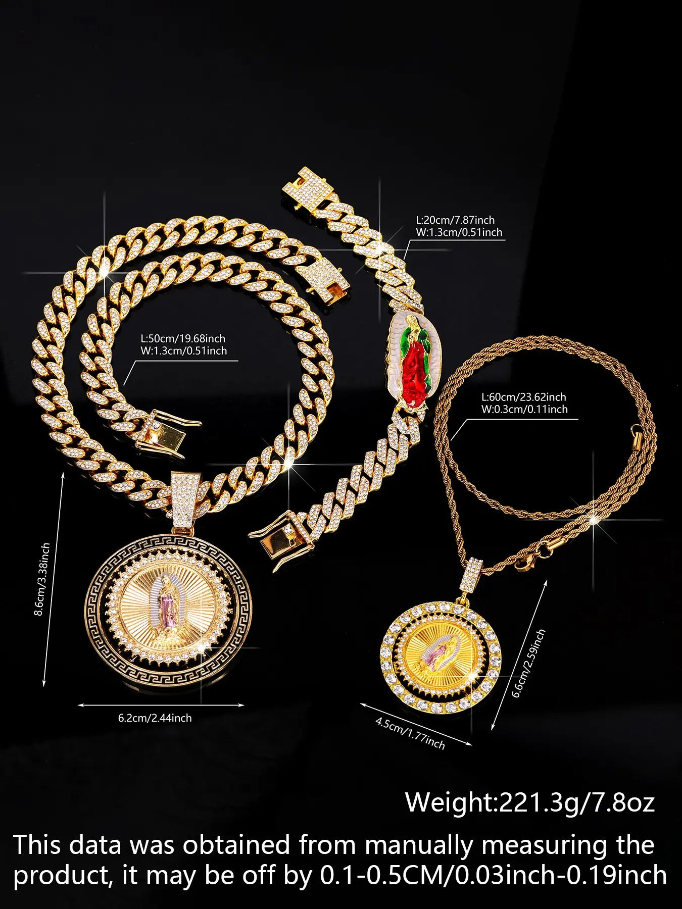 3pcs/set Men's Jewelry, Hip Hop Style Virgin Mary Pendant, Stacking Necklace & Bracelet Set, Iced Out Blingbling, Punk Style Accessory