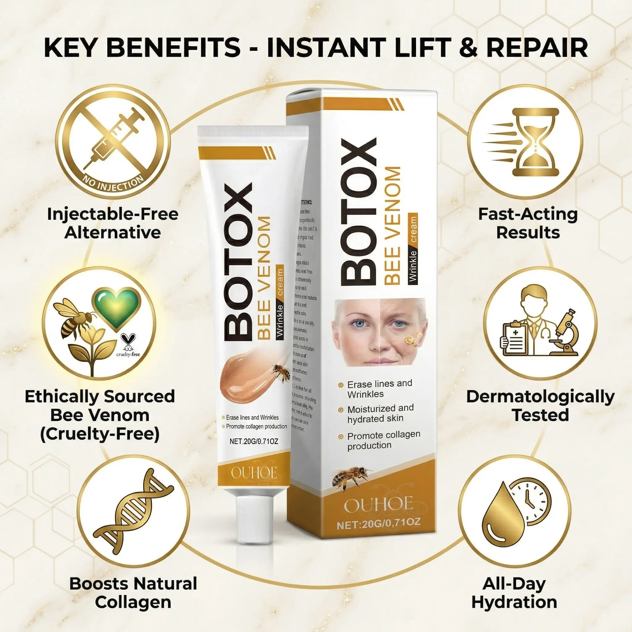· Bee venom: Stimulates collagen production and effectively improves wrinkles.