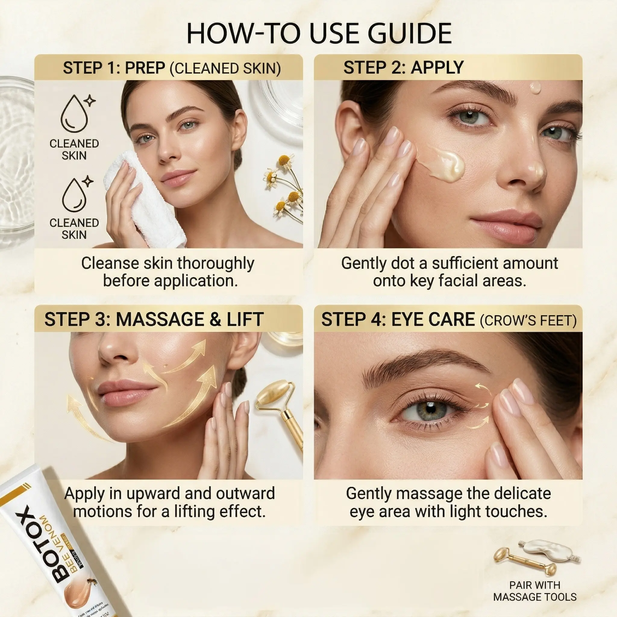 After cleansing and toning, take an appropriate amount of Bee Venom Wrinkle Cream and apply it evenly on the facial skin, and gently massage it with your hands in circular motions until it is absorbed.
