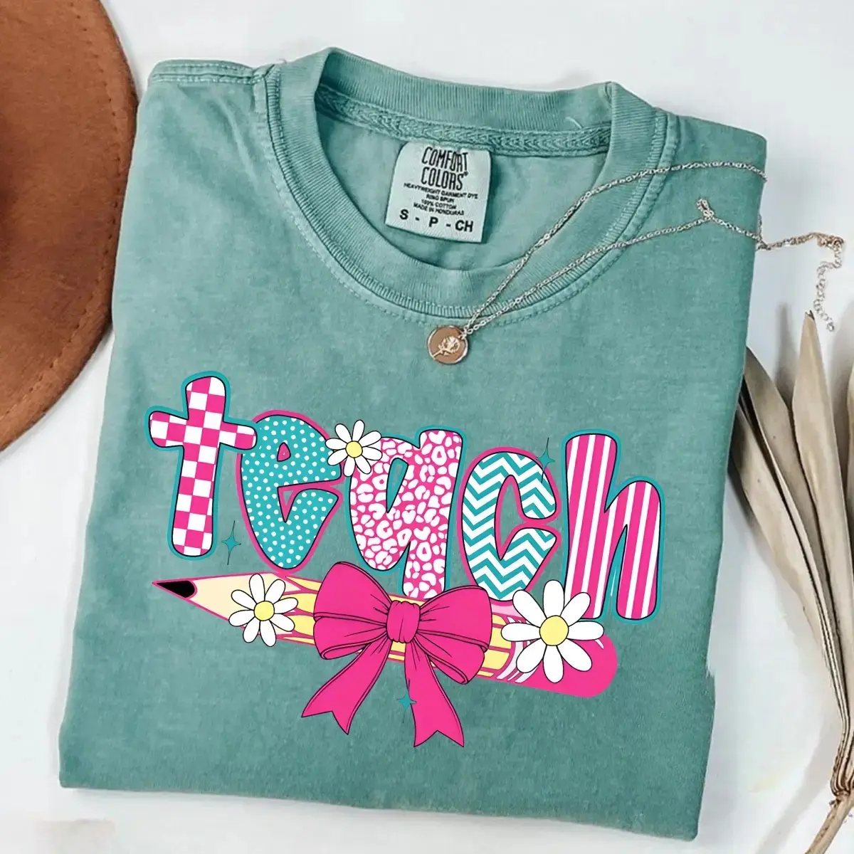 Comfort Colors Checkered Teacher T-Shirt - Floral Coquette Teacher T-Shirt, Preppy Teacher T-Shirt, Retro Teacher T-Shirt, Sublimation, Coquette Bow Tee