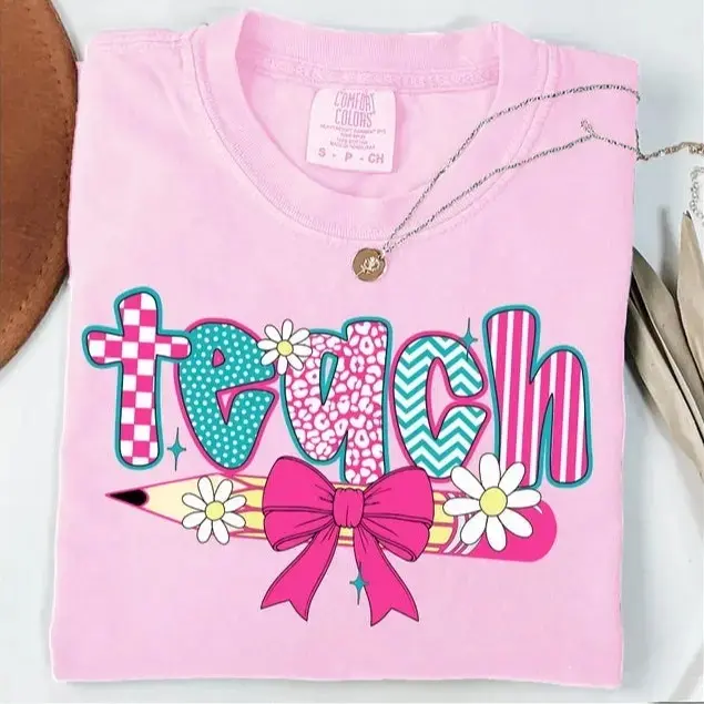 5. Comfort Colors Checkered Teacher T-Shirt - Floral Coquette Teacher T-Shirt, Preppy Teacher T-Shirt, Retro Teacher T-Shirt, Sublimation, Coquette Bow Tee