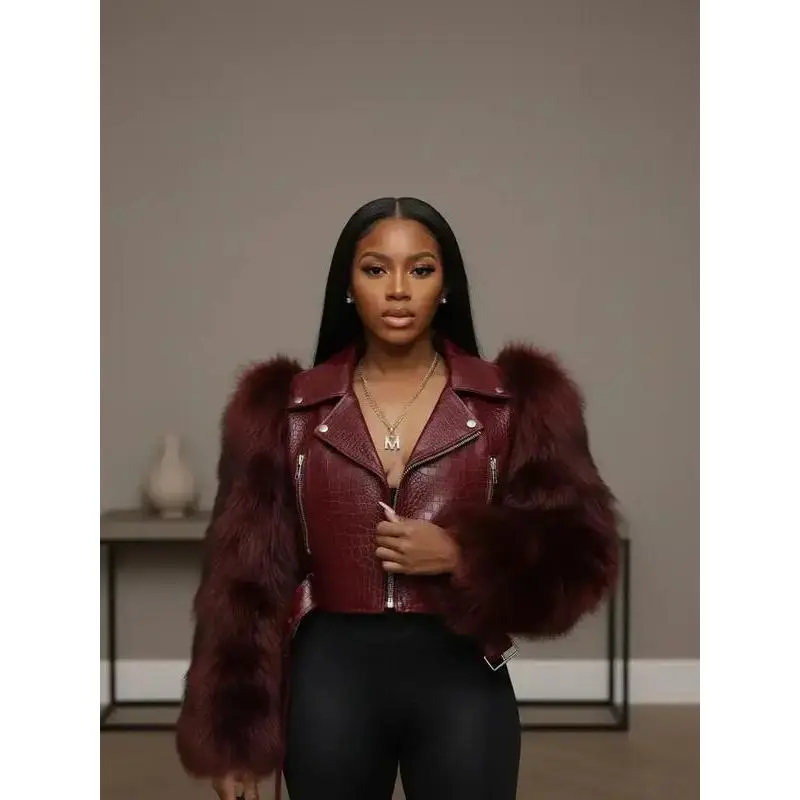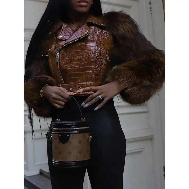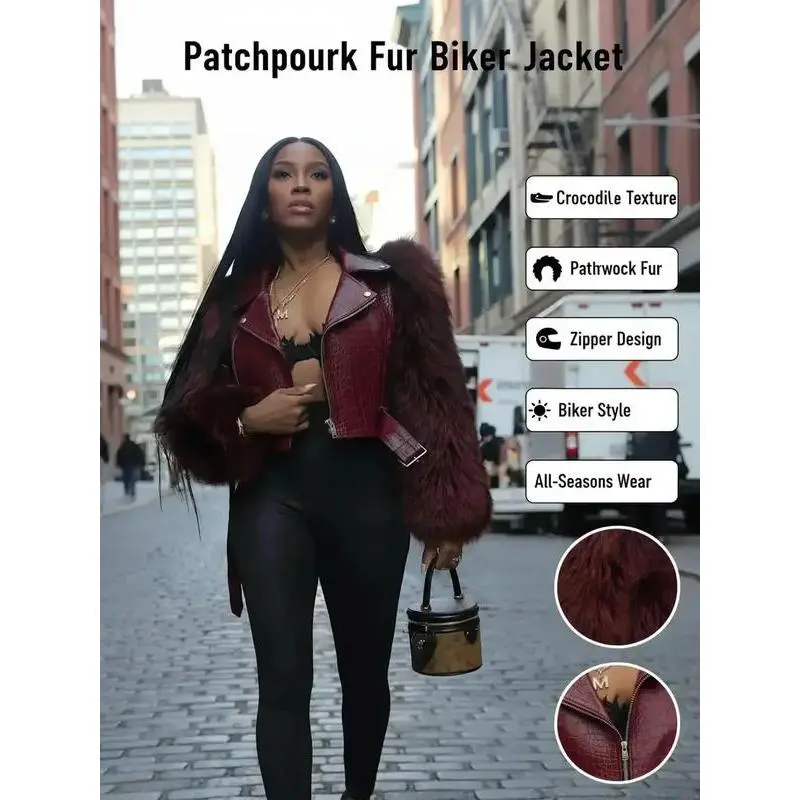 【Unique Material】: Crafted with faux crocodile leather for sleeves, offering a distinct luxurious touch and visual interest. 【Zipper Closure】: Features a classic motorcycle zipper, providing practical accessibility and enhancing the jacket's edgy look. 【Collar Design】: Incorporates a stylish lapel collar, contributing to a structured finish that complements both casual and upscale outings. 【Moderate Thickness】: Made with moderate thickness fabric, suitable for wearing throughout all seasons, offering year-round adaptability. 【Tailored Fit】: Designed in a fitted silhouette that highlights the body shape while ensuring ease of movement and wearability.