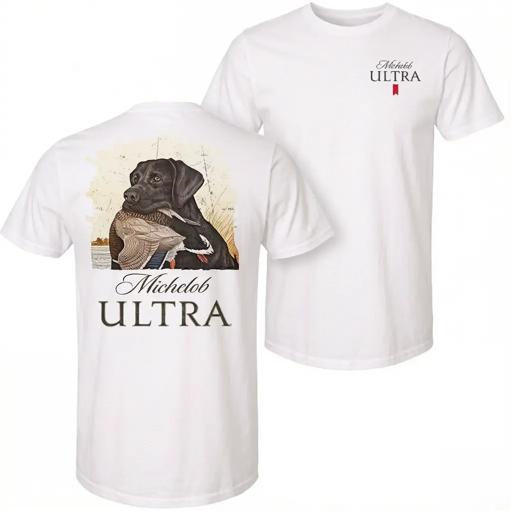 Michelob Ultra – Mallard and Dog T-Shirt – 2-Sided Design – Versatile Unisex Casual Wear – Cool Graphic Tee for Men – Menswear – Gift for Beer Lovers and Michelob Ultra Fans Round Neck Classic Clothes Cotton Fabric Soft -- fleece