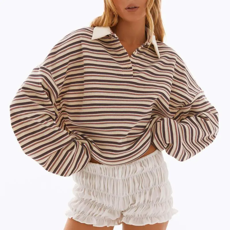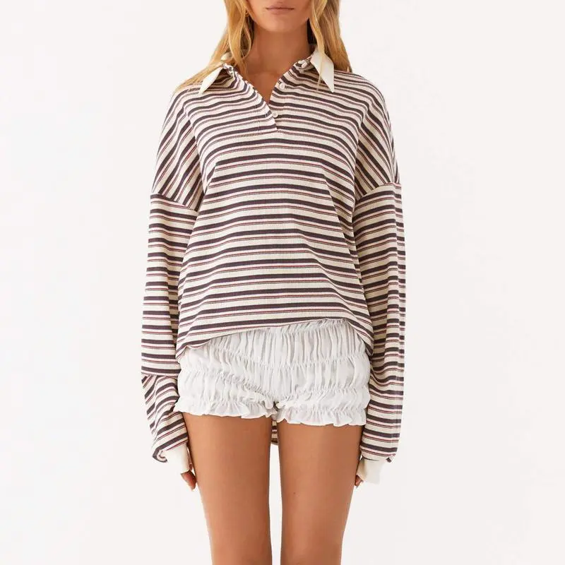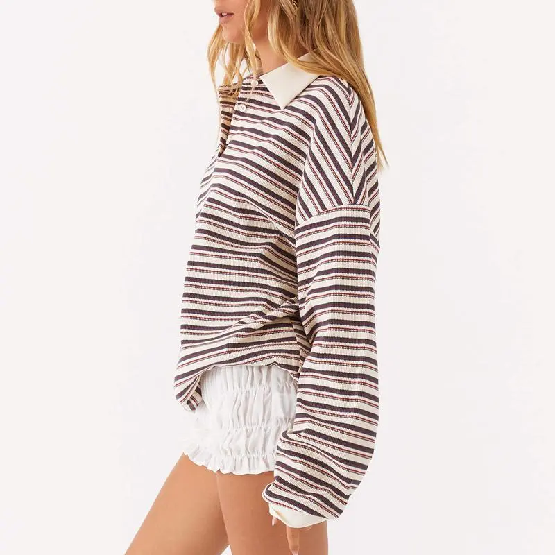 Women's Striped T-Shirts Contrast Color Long Sleeve Lapel Neck Button-up Casual Pullover Tops S Top Length: 68 Shoulder: 68 Bust: 118 Sleeve: 50 M Top Length: 69 Shoulder: 69 Bust: 122 Sleeve: 51 L Top Length: 70 Shoulder: 70.5 Bust: 128 Sleeve: 52 XL Top Length: 71 Shoulder: 72 Bust: 134 Sleeve: 53 S Top Length: 26.77 Shoulder: 26.77 Bust: 46.46 Sleeve: 19.68 M Top Length: 27.17 Shoulder: 27.17 Bust: 48.03 Sleeve: 20.08 L Top Length: 27.56 Shoulder: 27.76 Bust: 50.39 Sleeve: 20.47 XL Top Length: 27.95 Shoulder: 28.35 Bust: 52.76 Sleeve: 20.87 Material: 95% Polyester, 5% Elastane Sleeve: Long Sleeve Applicable Gender: Female 1 * Striped T-Shirt 1. Due to manual measurement, there may be an error of 1-2 cm in size. 2. Depending on the computer monitor used, colors may differ from actual colors. If the product has any quality problems, please let us know, we will help you solve the problem as quickly as possible.
