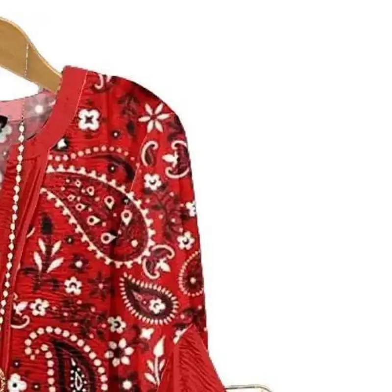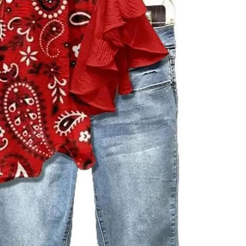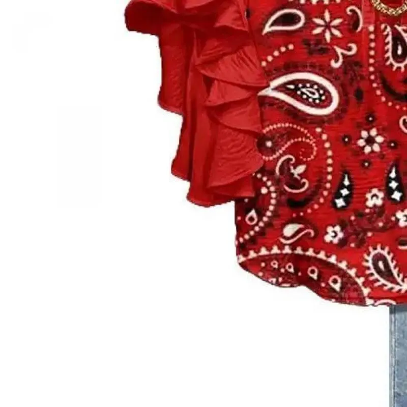 About this item: Distinctive Paisley Pattern: This red top is adorned with black and white paisley patterns, presenting a unique and eye-catching look that makes it stand out from the crowd. Elegant V-neck Design: The V-neck adds a touch of sophistication, elongating the neckline and enhancing the overall elegance of the outfit. Charming Ruffled Three-quarter Sleeves: The ruffled three-quarter sleeves bring a feminine and playful element, making this top a fashionable choice. Exquisite Details: The paisley patterns are meticulously drawn with smooth lines and distinct color contrasts. The ruffled cuffs are neatly sewn, demonstrating superior craftsmanship. Versatile and Practical: Whether paired with jeans to show a casual and laid-back style or matched with a short skirt to create a lively atmosphere, it can be easily carried off, suitable for a variety of occasions. It is a practical item for creating fashionable looks.Package Include: 1*Top