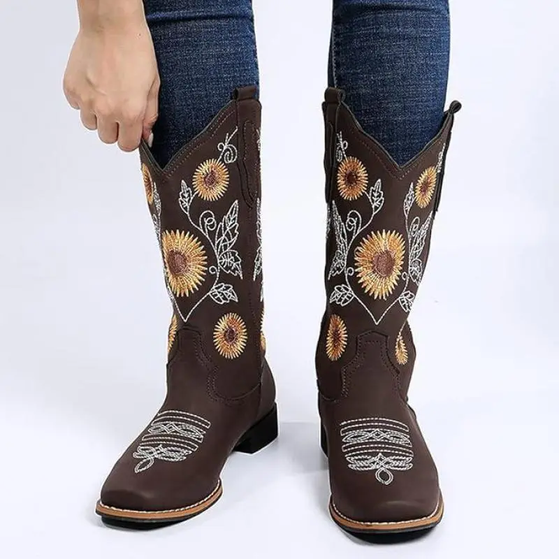 Cowgirl Western Boots for Women Mid Calf Sunflower Embroidery Stitched Square Toe Low Heel US 6-10.5 Walking Shoes Leather Casual Footwear Comfort Decor Bota