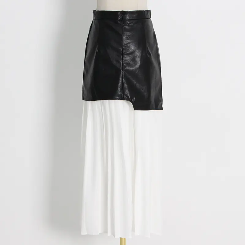 Asymmetric Patchwork Faux Leather Chiffon Pleated Maxi Skirt