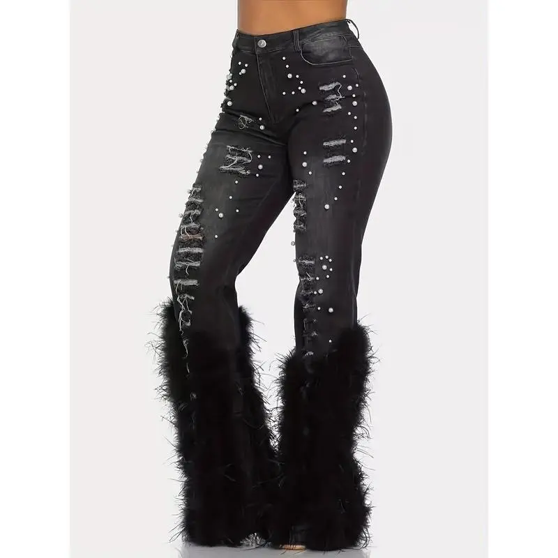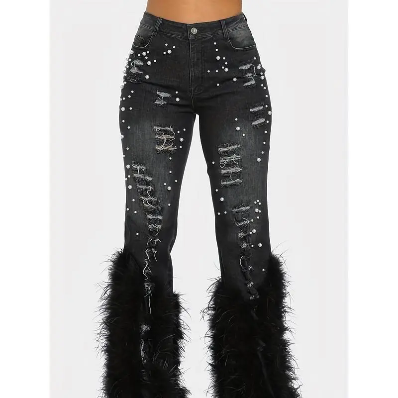 Denim Ripped Design Pearl Embellished Jeans