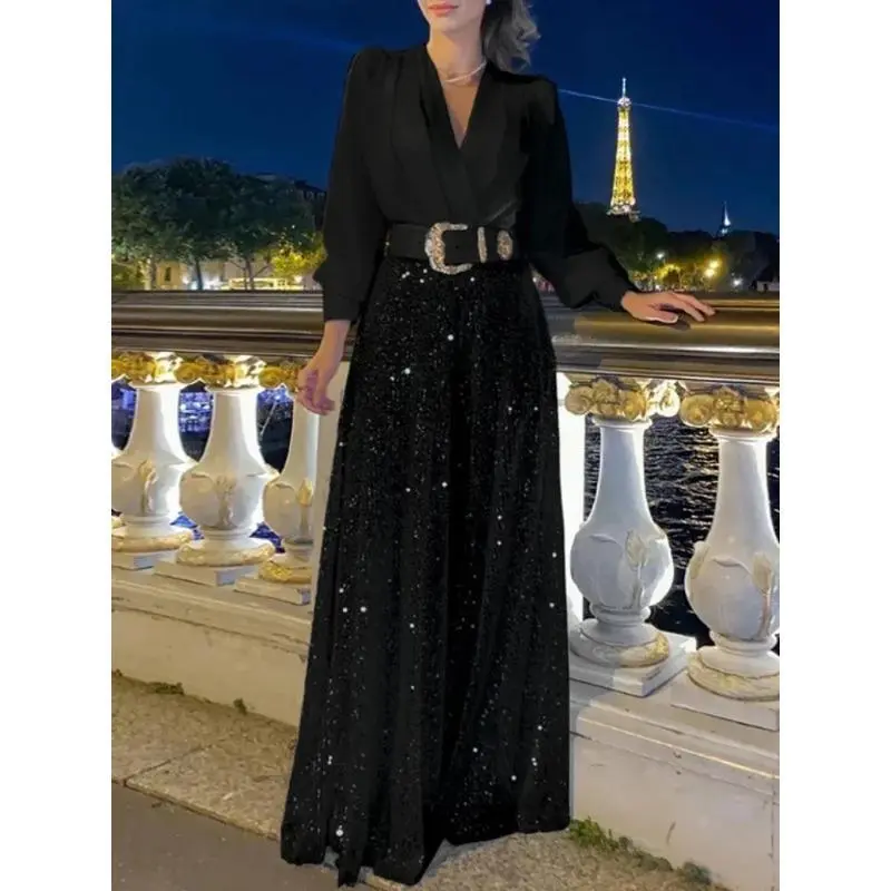 Splice Sequins Maxi Dresses For Women Fashion Folds Loose V Neck Elegant Dress Femme Party Evening Dresses Luxury 2024 Formal Womenswear Green Basic