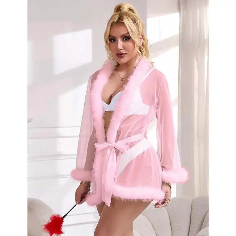 Fabric: This women's long-sleeve nightgown is made of high-quality transparent mesh fabric and faux fur Fashionable Sexy Nightgown: Transparent Nightgown, Short Sleeve Design, Slanted V-neck, Ribbon Decoration, Sleeves or Hem Trimmed with Faux Fur, Perfectly Shows Your Figure, Makes You Look More Elegant Suitable for Occasions: Perfect as a bridesmaid dress or bridal chamber dress! Ideal for Valentine's Day gifts, bridal lingerie gifts, bachelorette parties, lingerie parties, birthday parties, costume parties, maternity photoshoots, bridal chamber photoshoots, comedy performances, or late-night dates with your special partner Great Gift: The transparent mesh bathrobe can be used as a perfect gift for brides, best friends, lovers, wives, newlyweds, or as a treat for yourself on weddings, birthdays, honeymoons, Valentine's Day, Christmas, Halloween, anniversaries, and other holidays Style: Transparent Robe with Fur, Mesh Short Sleeve Bridal Kimono Robe Nightgown, Feather Bridal Robe for Wedding