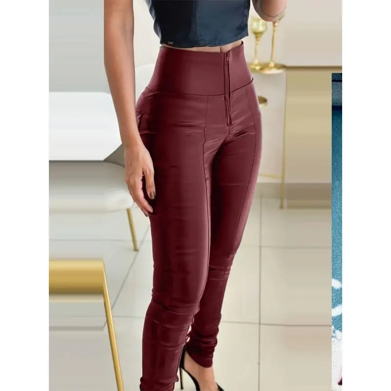 [Tummy Control Leather Pants] High-Waist Tummy Control Women's PU Leather Skinny Pants - Zipper Fly, Anti-Chafing Lining, Double-Layer Support, Red, Casual Style, Comfortable Fit Bottoms Womenswear Fabric Spandex