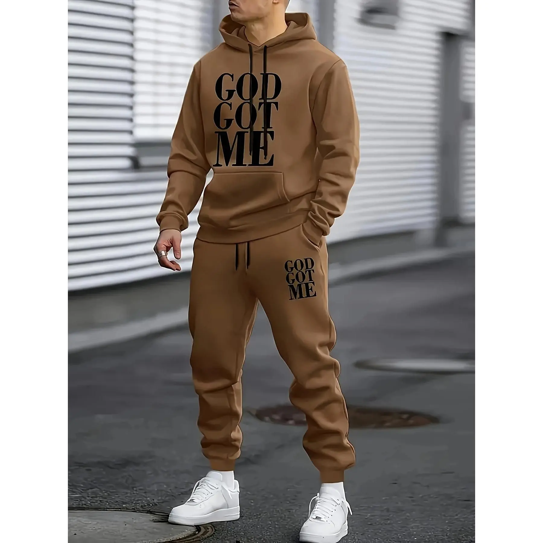 Men's lion print hooded sweatshirt and sweatpants set -100% polyester fiber casual sportswear, hooded long sleeved top and pocket, regular cut knitted fabric, comfortable, animal pattern