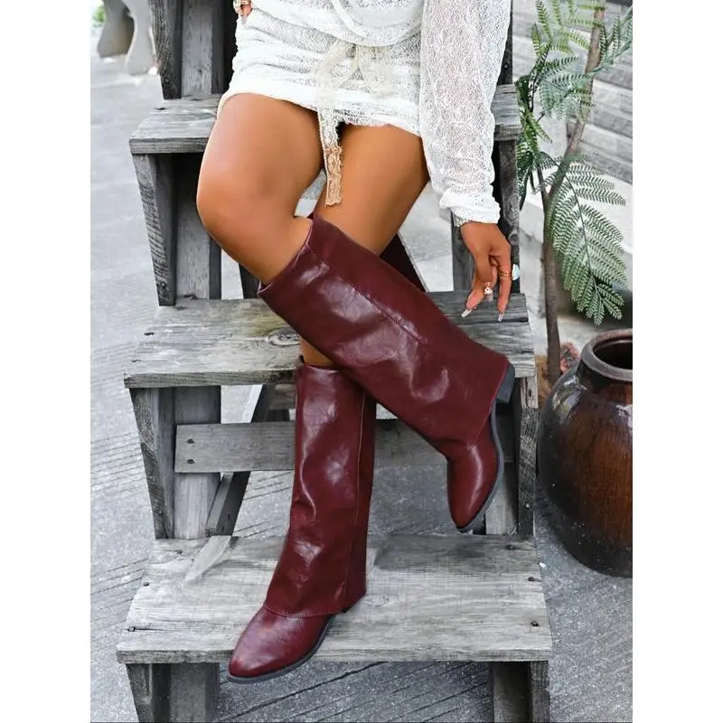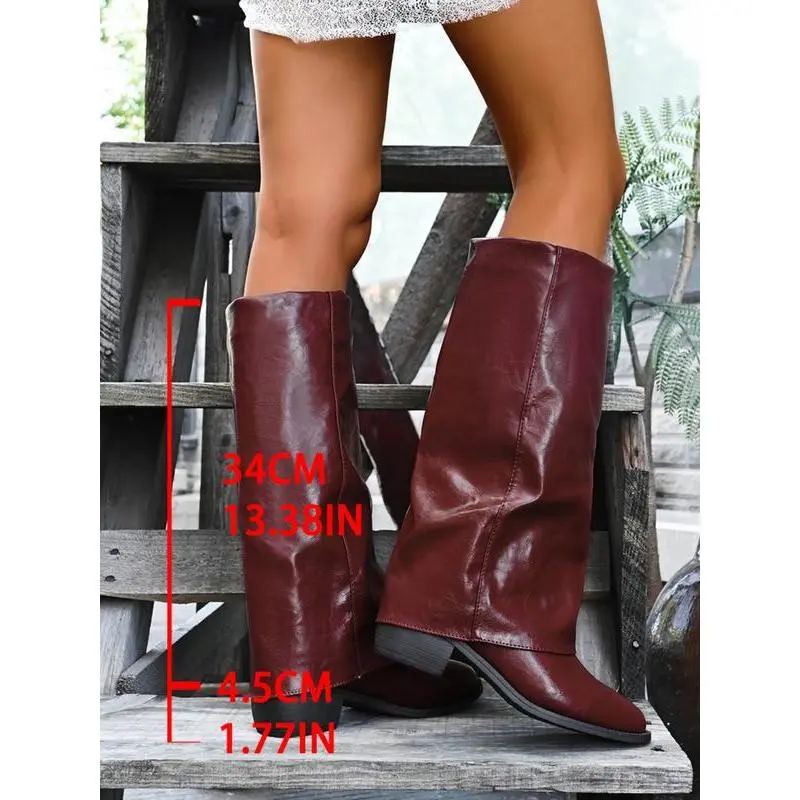 【High-Top Design】: Featuring a classic high-top silhouette that offers additional coverage and support for the ankle. 【Bold Color】: Available in a deep wine red color that makes a striking statement and enhances your wardrobe. 【Durable Materials】: Constructed with PU leather for the upper and rubber materials for the sole, ensuring reliable wear and longevity. 【Knee Height】: With a knee-high cut, these boots provide warmth and style, perfect for the fall and winter seasons. 【Pointed Toe】: Designed with a pointed toe shape, adding a refined touch while offering a contemporary look.