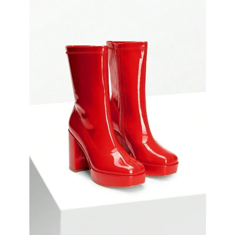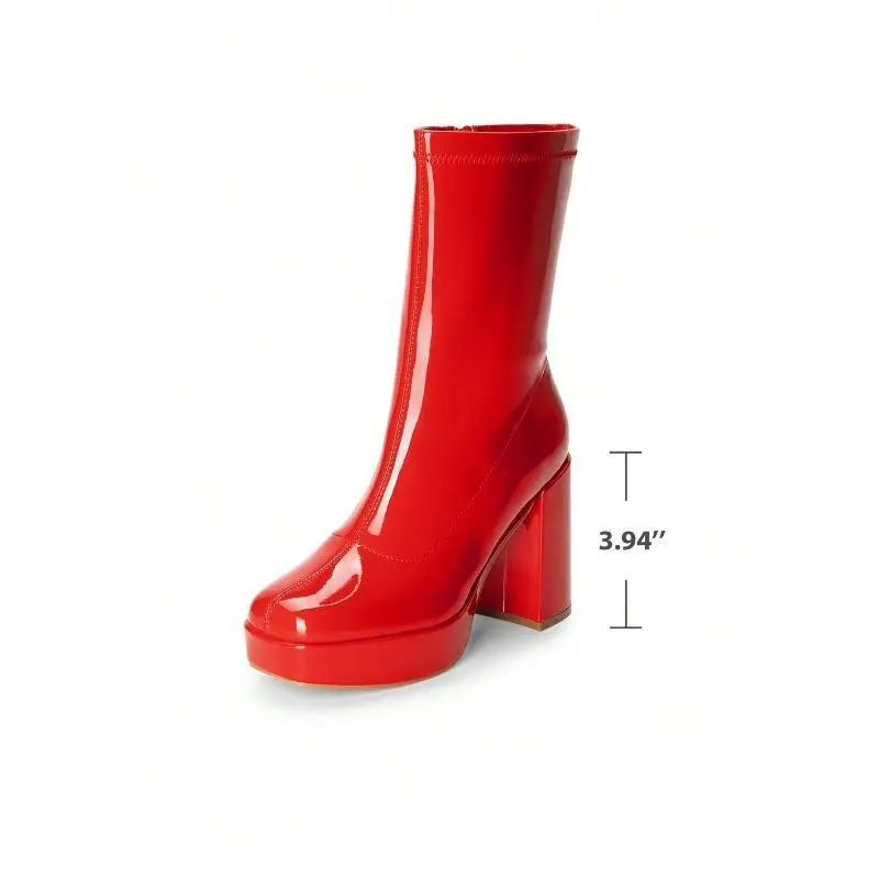 Women Silver Platform Boots Chunky Heel Square Toe Mid Calf Waterproof Lightweight Party Boots for Halloween and Christmas Events