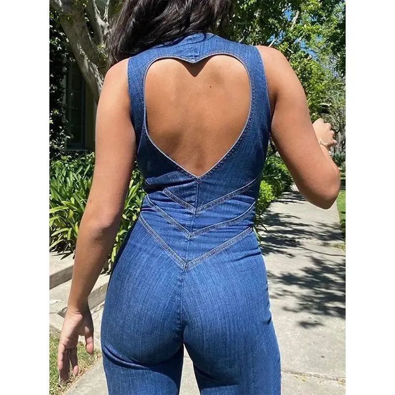 Heart Hollow Out Women Jumpsuit Backless Sleeveless Solid Denim Lady Jumpsuits 2025 Sexy Zipper Solid Slim Female Playsuit Womenswear Overalls