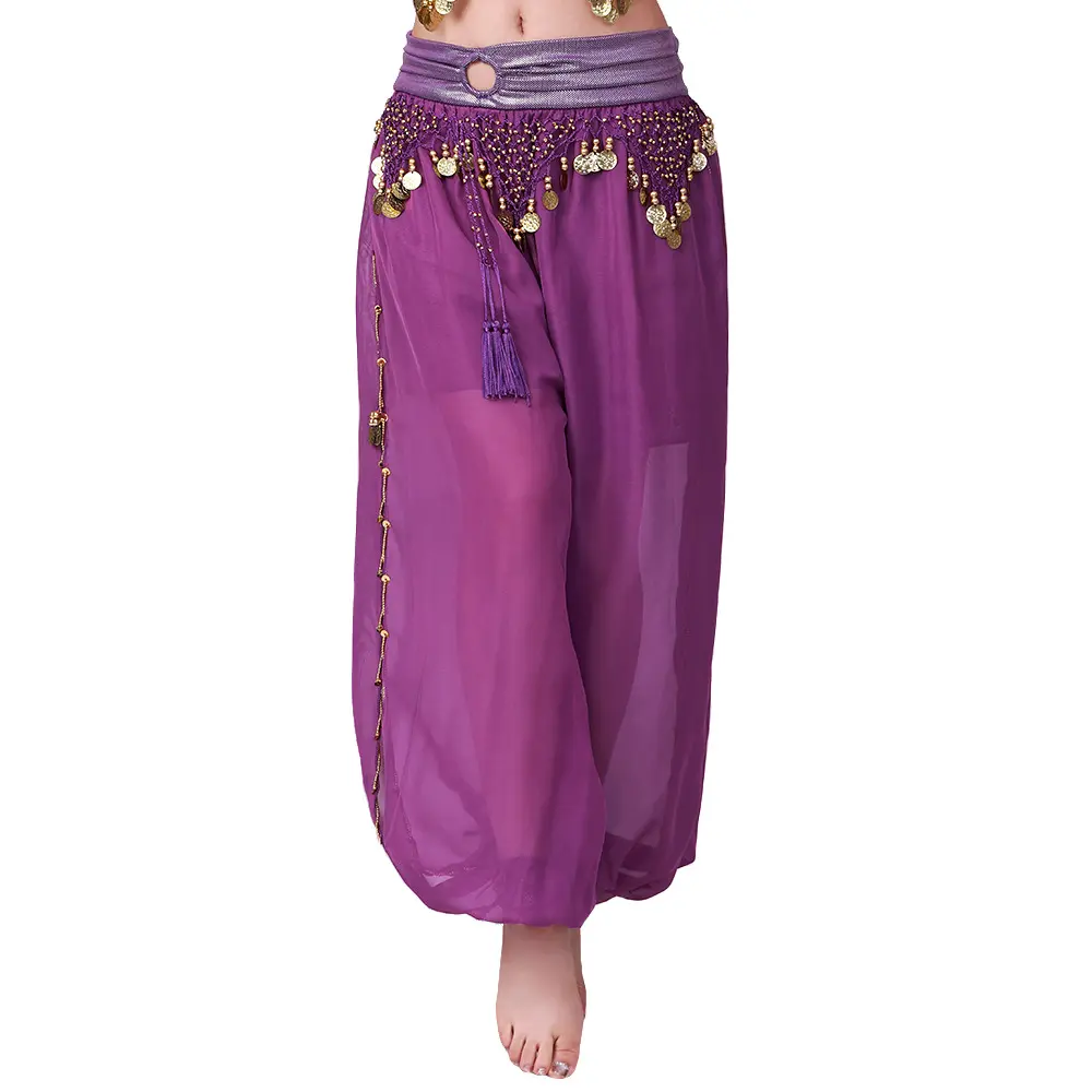 WomenChiffonBellyDanceHaremPantsArabicBellydancePantsBloomersTrousersWithGoldTrimTasselsWomenDancingPants