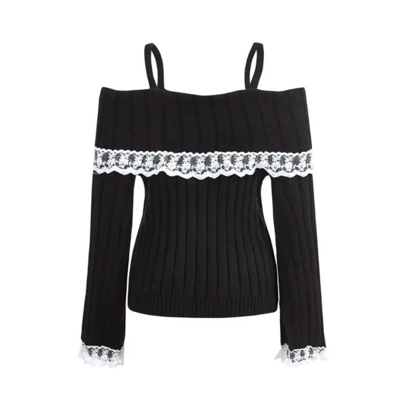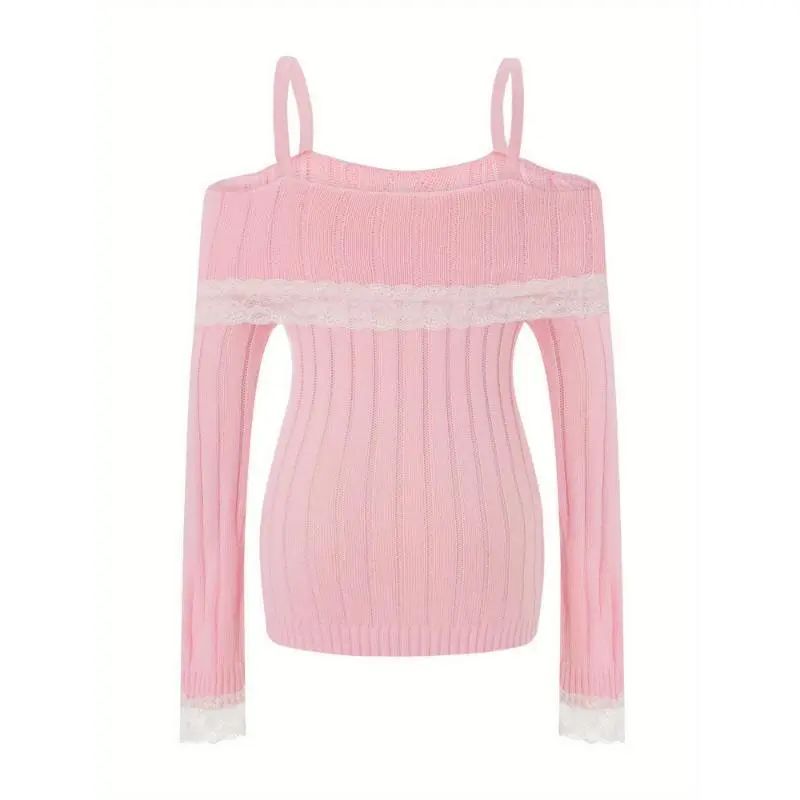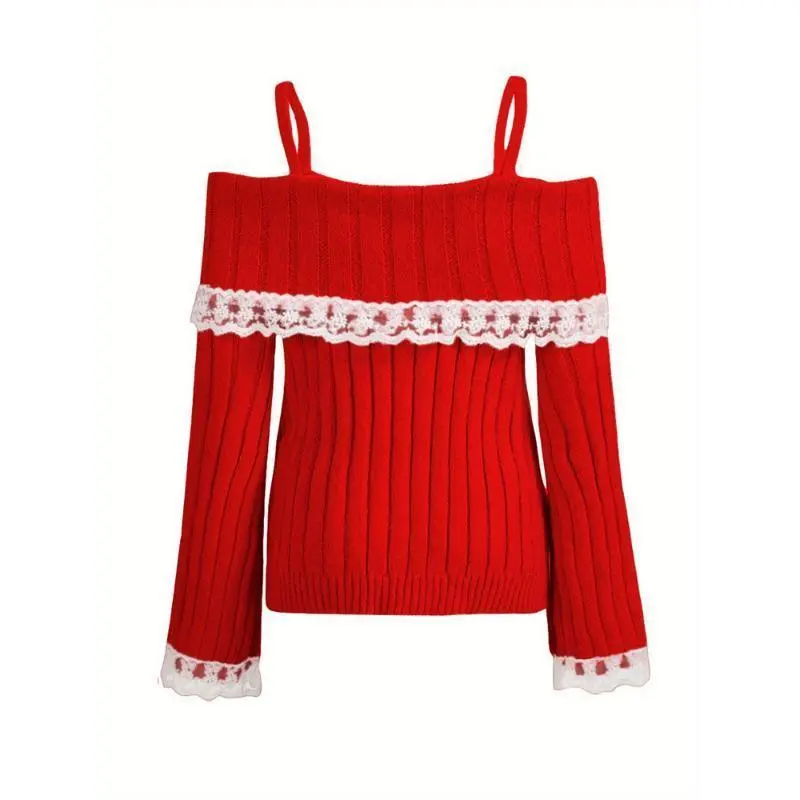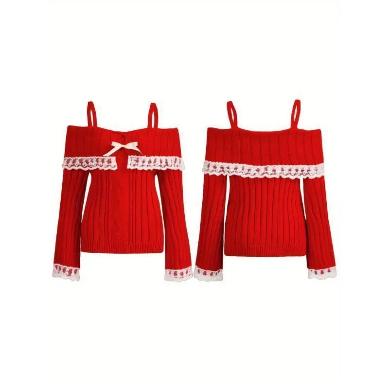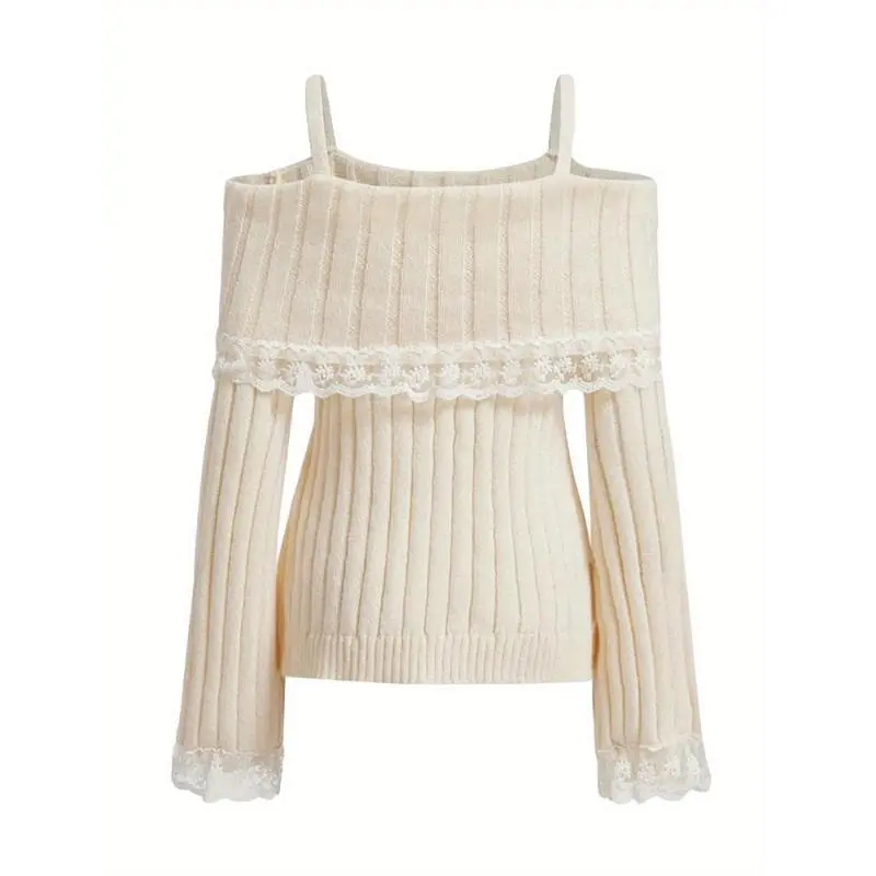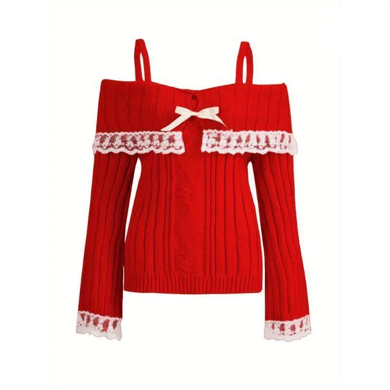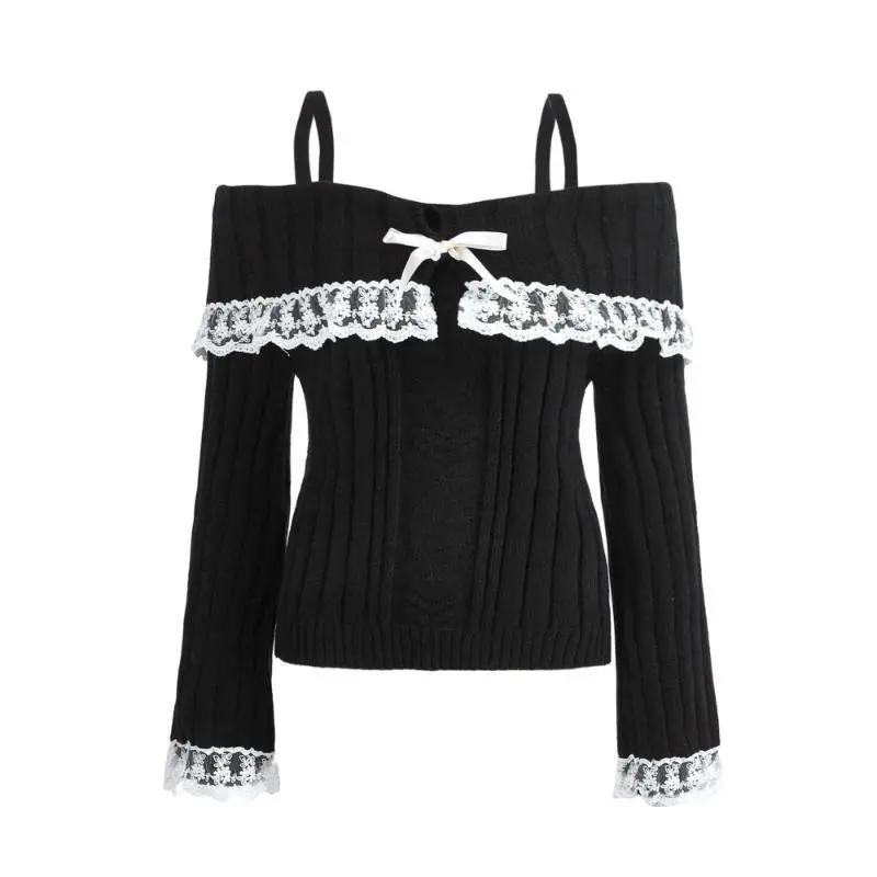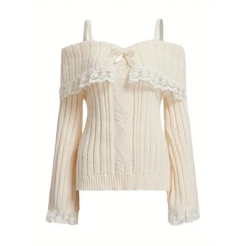 Chic Off-Shoulder Lace Trim Sweater For Women - Long Sleeve, Bow Detail, Acrylic Knit Pullover Fashion Trendy