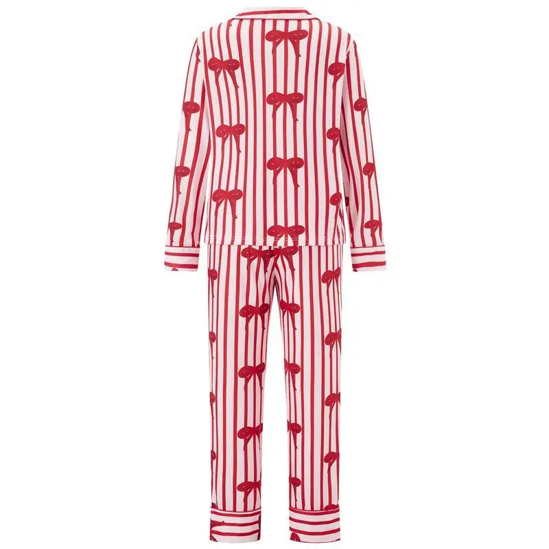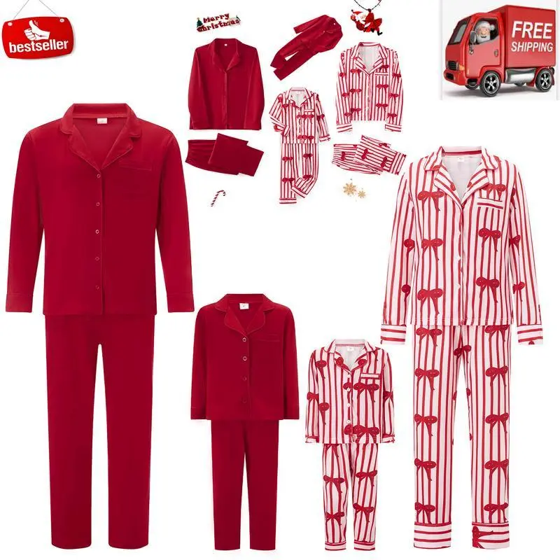 Matching family pajamas Couple PJ sets Lapel neck pajamas Button-up sleepwear Long sleeve loungewear Holiday pajama set Christmas family outfits Cozy two-piece set Bow detail pajamas TikTok viral loungewear