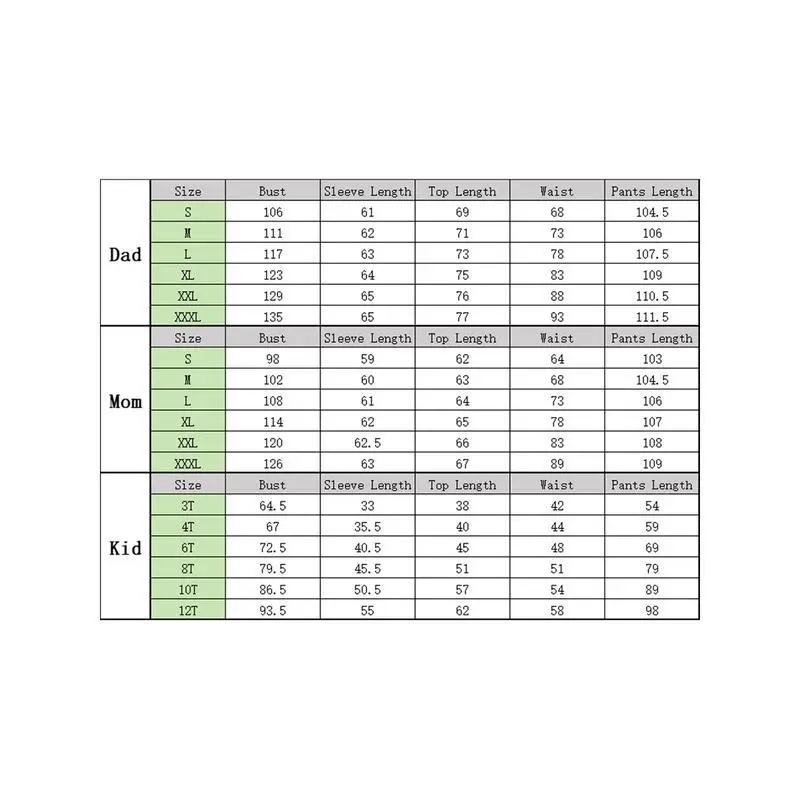 Family Matching Pajama Set Lapel Neck Button-up Long Sleeve Tops Long Pants 2-Piece Bow/Solid Color Loungewear Outfit S Tops Length: 69/27.17 Bust: 106/41.73 Pants Length: 104.5/41.14 Waist: 68/26.77 M Tops Length: 71/27.95 Bust: 111/43.7 Pants Length: 106/41.73 Waist: 73/28.74 L Tops Length: 73/28.74 Bust: 117/46.06 Pants Length: 107.5/42.32 Waist: 78/30.71 XL Tops Length: 75/29.53 Bust: 123/48.43 Pants Length: 109/42.91 Waist: 83/32.68 XXL Tops Length: 76/29.92 Bust: 129/50.79 Pants Length: 110.5/43.5 Waist: 88/34.65 XXXL Tops Length: 77/30.31 Bust: 135/53.15 Pants Length: 111.5/43.9 Waist: 93/36.61 S Tops Length: 62/24.41 Bust: 98/38.58 Pants Length: 103/40.55 Waist: 64/25.2 M Tops Length: 63/24.8 Bust: 102/40.16 Pants Length: 104.5/41.14 Waist: 68/26.77 L Tops Length: 64/25.2 Bust: 108/42.52 Pants Length: 106/41.73 Waist: 73/28.74 XL Tops Length: 65/25.59 Bust: 114/44.88 Pants Length: 107/42.13 Waist: 78/30.71 XXL Tops Length: 66/25.98 Bust: 120/47.24 Pants Length: 108/42.52 Waist: 83/32.68 XXXL Tops Length: 67/26.38 Bust: 126/49.61 Pants Length: 109/42.91 Waist: 89/35.04 3T Tops Length: 38/14.96 Bust: 64.5/25.39 Pants Length: 54/21.26 Waist: 42/16.54 Advised Age: 3 Years 4T Tops Length: 40/15.75 Bust: 67/26.38 Pants Length: 59/23.23 Waist: 44/17.32 Advised Age: 4 Years 6T Tops Length: 45/17.72 Bust: 72.5/28.54 Pants Length: 69/27.17 Waist: 48/18.9 Advised Age: 6 Years 8T Tops Length: 51/20.08 Bust: 79.5/31.3 Pants Length: 79/31.1 Waist: 51/20.08 Advised Age: 8 Years 10T Tops Length: 57/22.44 Bust: 86.5/34.06 Pants Length: 89/35.04 Waist: 54/21.26 Advised Age: 10 Years 12T Tops Length: 62/24.41 Bust: 93.5/36.81 Pants Length: 98/38.58 Waist: 58/22.83 Advised Age: 12 Years Material: 100% Elastane Pattern: Bow/Solid Color Sleeve: Long Sleeve Applicable Occasion: Indoor, Outdoor 1 * Pajama Set (1* Tops + 1* Long Pants) 1. Due to manual measurement, there may be an error of 1-2 cm in size. 2. Depending on the computer monitor used, colors may differ from actual colors. 3. Please wash dark and light colored clothes separately to avoid staining. If the product has any quality problems, please let us know, we will help you solve the problem as quickly as possible.