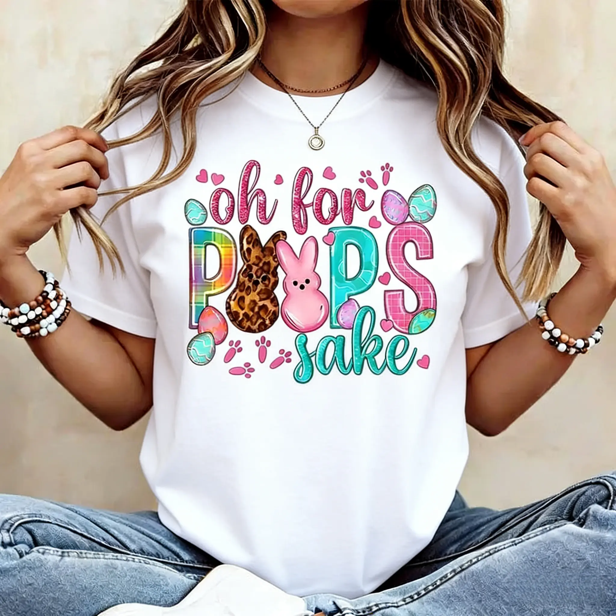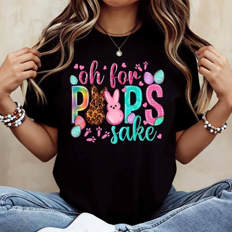 Oh For Peeps Sake Easter Bunny Rabbit Cotton T Shirt Women's Casual Round Neck Short Sleeve Regular Fit Summer Top Machine Washable USA Made Fashion Graphic Tee for Easter Party Fun Holiday Wear