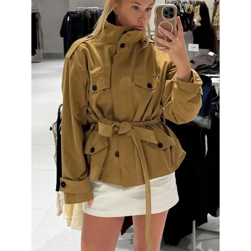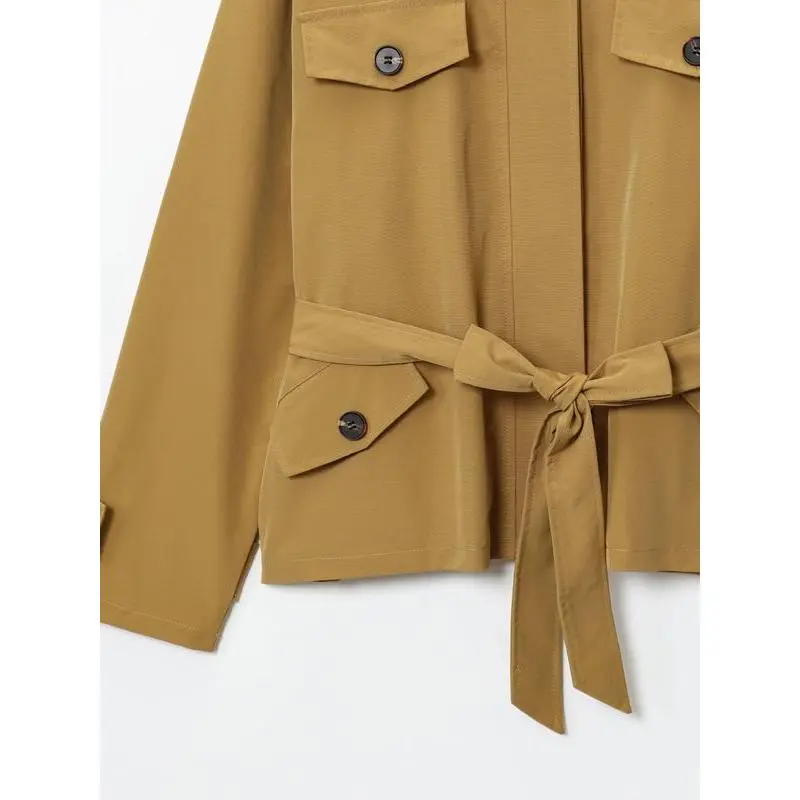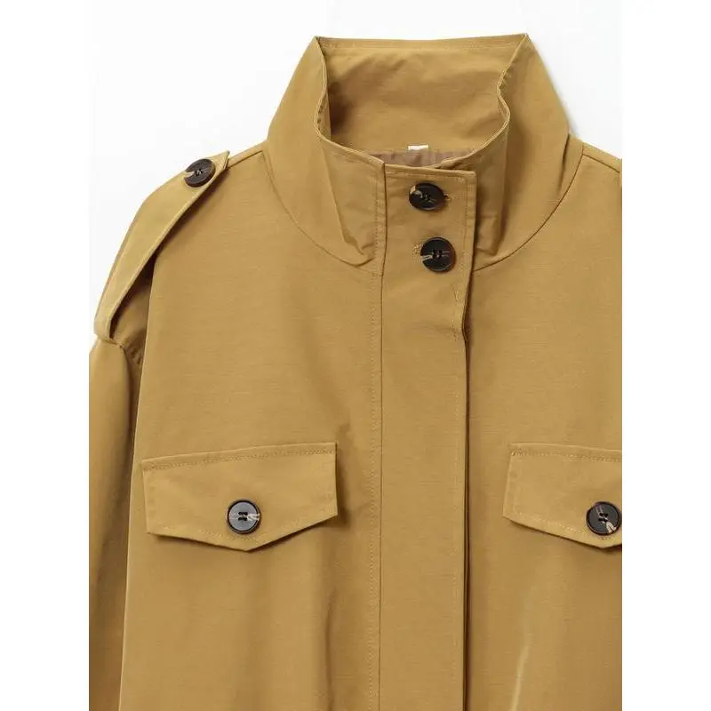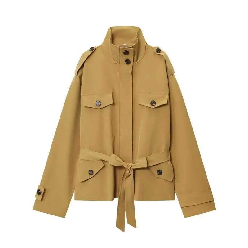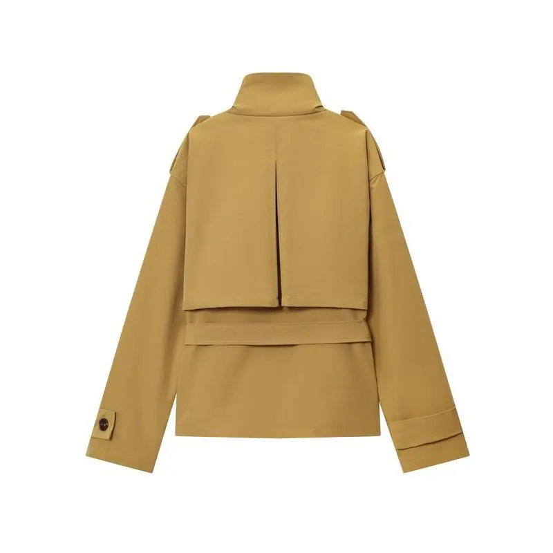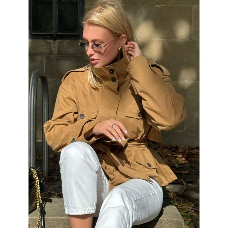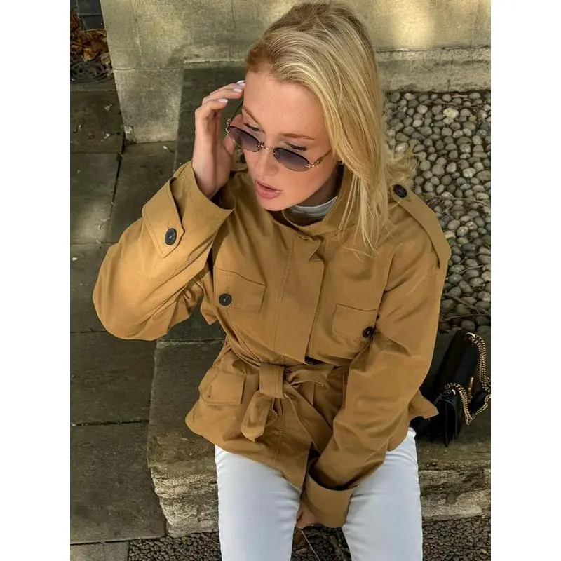 Camel Cropped Trench Jacket Belted Waist Stand Collar Jacket Multiple Flap Pockets Shoulder Accents Streetwear Casual Women's Layered Outerwear