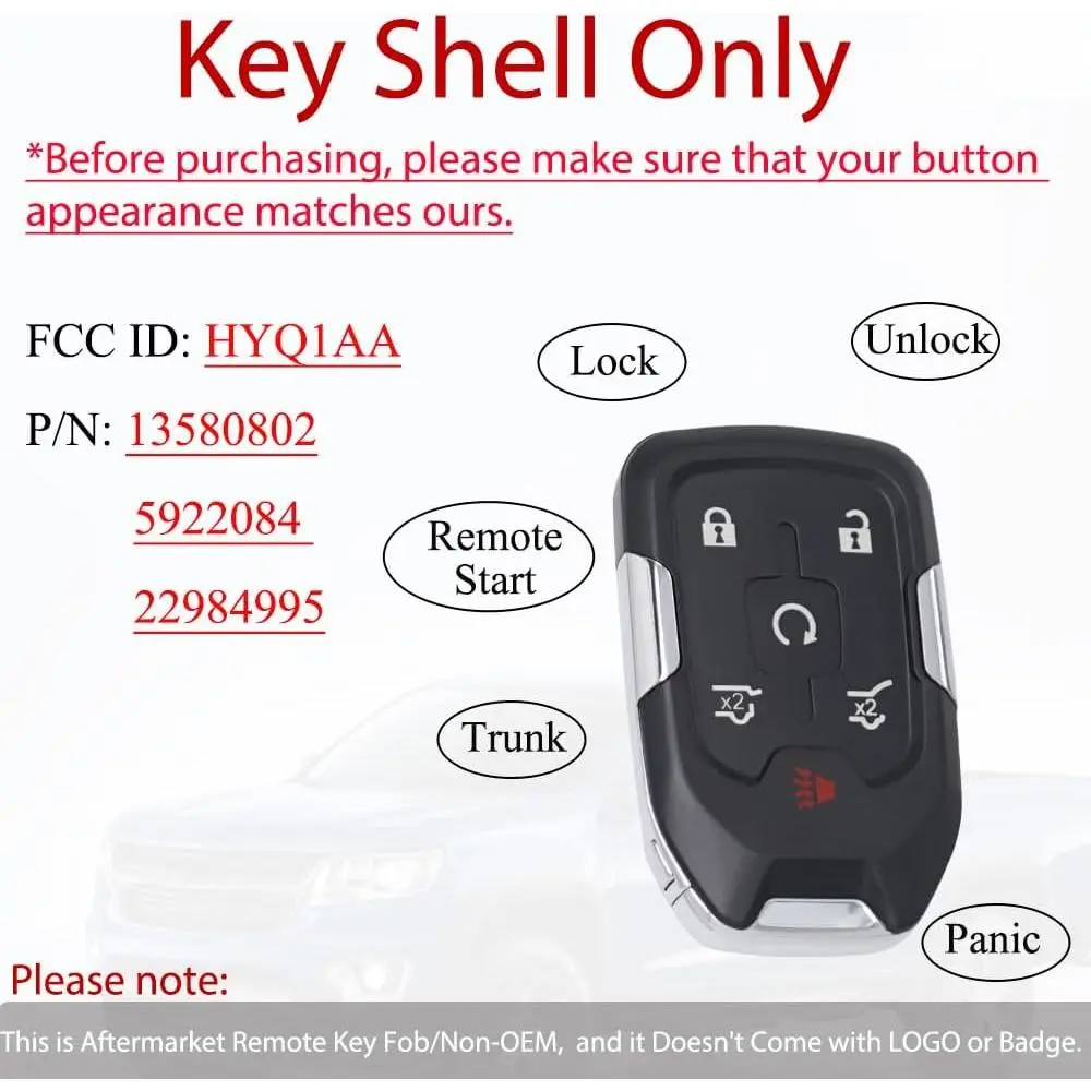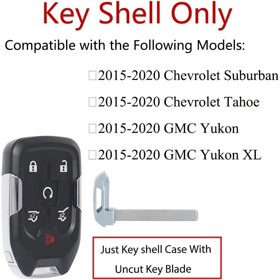 ✨ Compatible with GMC Yukon XL, Chevy Suburban, Tahoe 2015-2020. This 6-button key fob shell fits various models including GMC Sierra, Chevrolet Silverado, and GMC Acadia. It includes a key blade only, no electronics. Check the original key fob for compatibility. Watch the installation video for guidance.