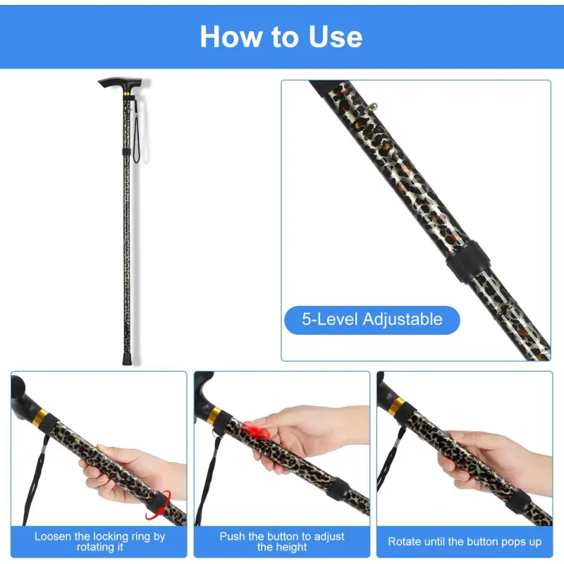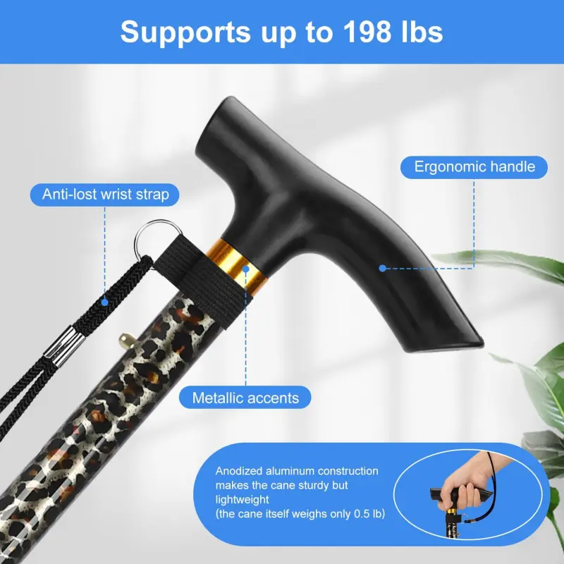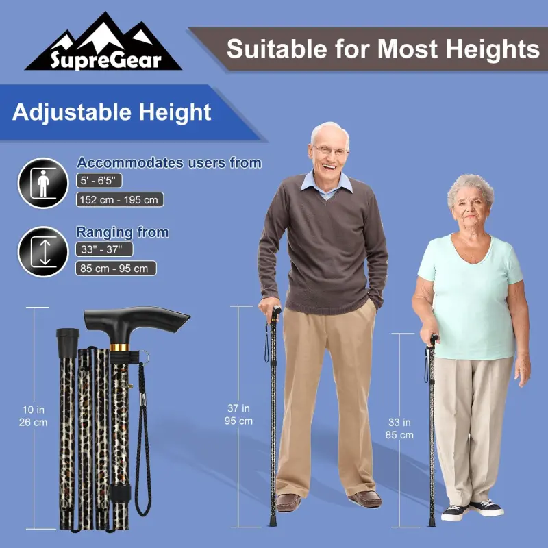 Effortlessly fold our SupreGear Folding Cane into 4 sections with a 10 inch length for compact storing and traveling whenever needed, and easily flip back out with secure for continued, safe useideal for elderly, disabled, injured, men or women, indoor or outdoorAdjust cane height to your personal preference from 33 to 37 inch in 5 different settingsplease measure the distance from your wrist joint down to the floor and this should be the proper cane height for youAnodized aluminum construction makes the cane sturdy but lightweight for easy carrying and usethe cane itself weighs only 0.5 lb and supports up to 198 lbsContoured and ergonomic T handle design helps reduce wrist pressure and increase hand comforta wrist strap for added safety and securityThe tip is made of sturdy TPR anti-slip material, providing traction and stabilityit could be replaced to other types of cane tips to meet various requirements