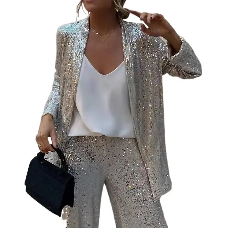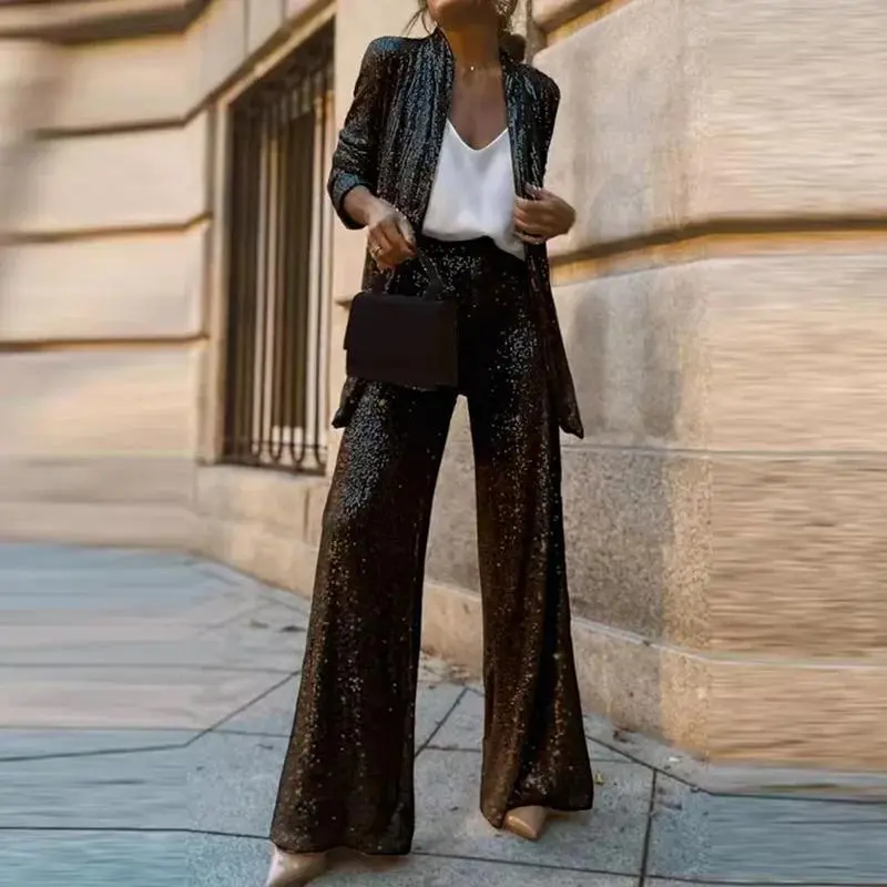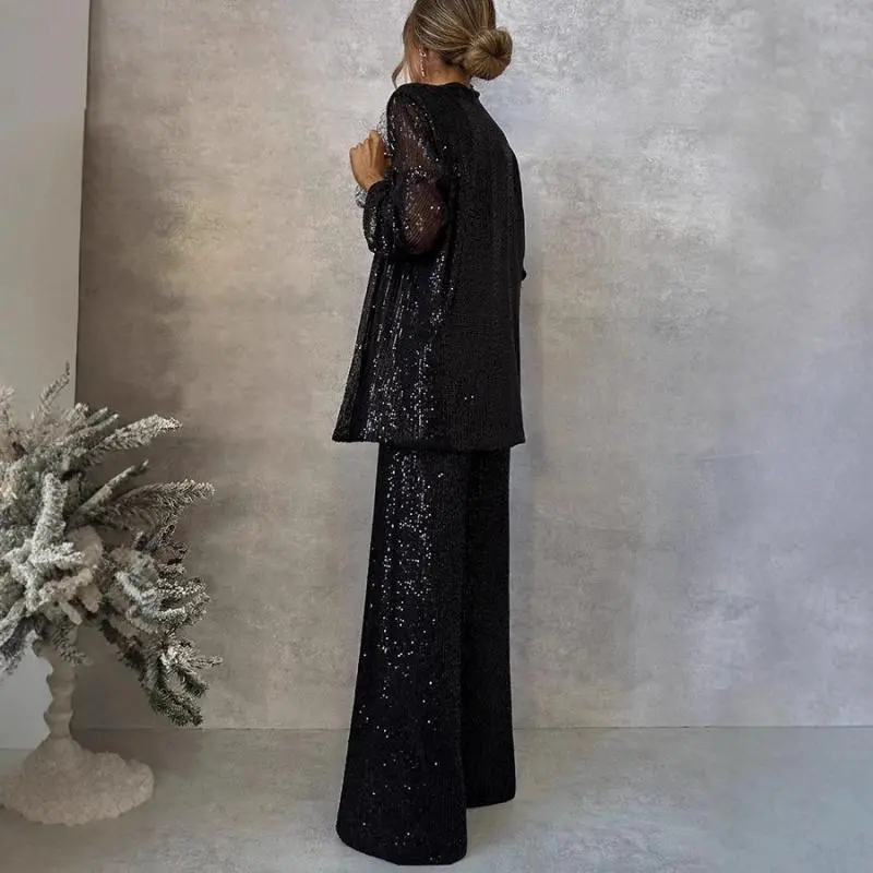 ShinySequinCasualElegantVacationStreetStyleLongSleeveTopandWide-LegPantsSetWomenswearSuits