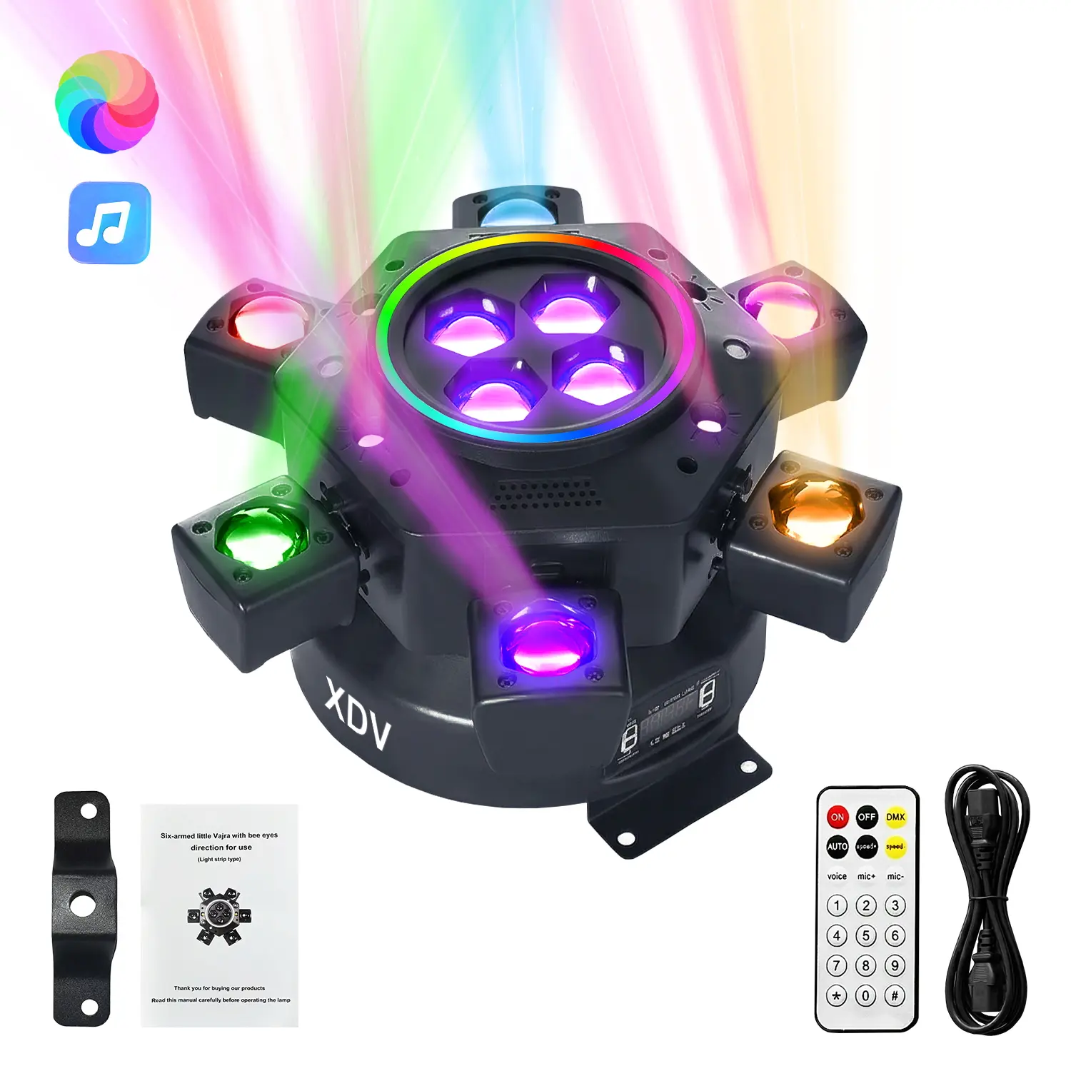 6 moving arms + RGBW LEDs + bee‑eye + lasers + strobes – all in one compact fixture. Perfect for DJs, bands, weddings, and backyard raves.