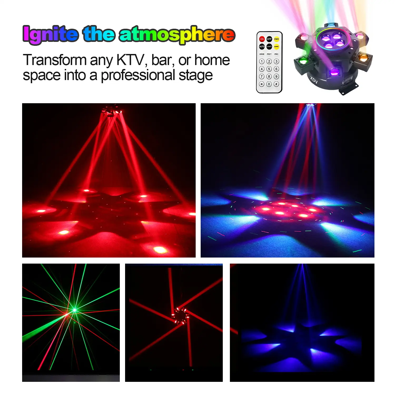 All‑in‑one design: Each light integrates 6 rotating arms, 360° bee‑eye, red/green lasers, sound‑active / DMX control. One fixture does the work of four traditional lights.