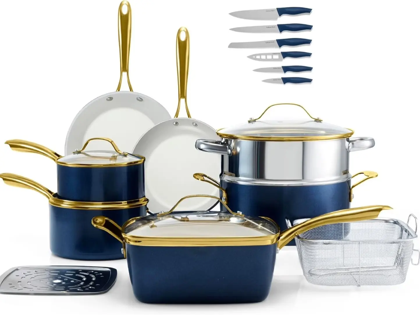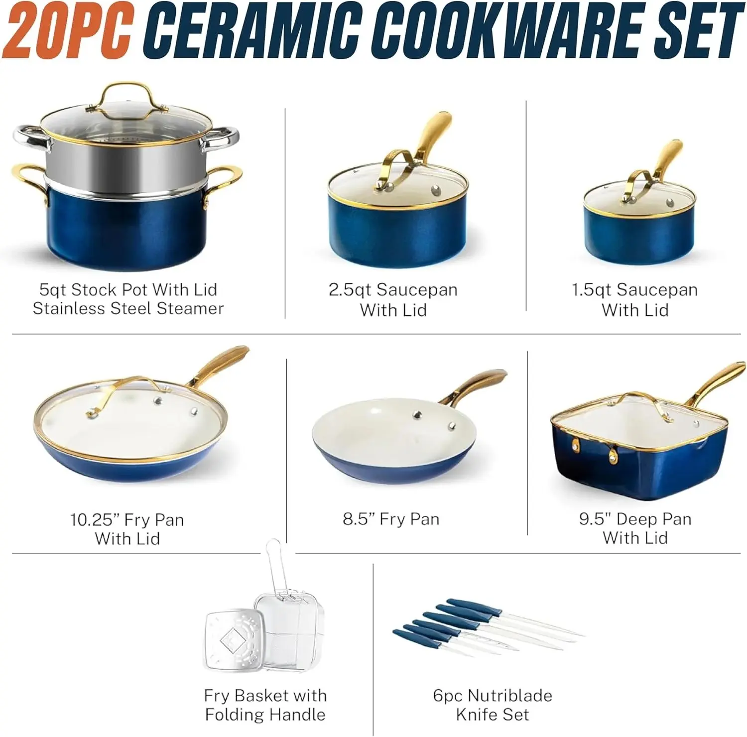 ·Comprehensive Set: Includes an 8" frying pan, 10.25" frying pan with lid, 1.5 Qt saucepan, 2.5 Qt saucepan with lid, 5 Qt stockpot with lid, and a 6-piece Nutriblade knife set.