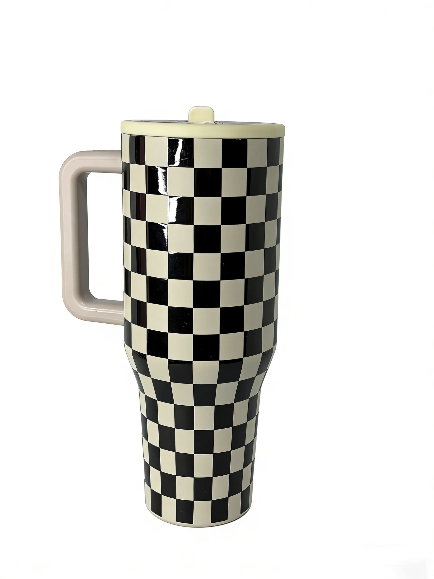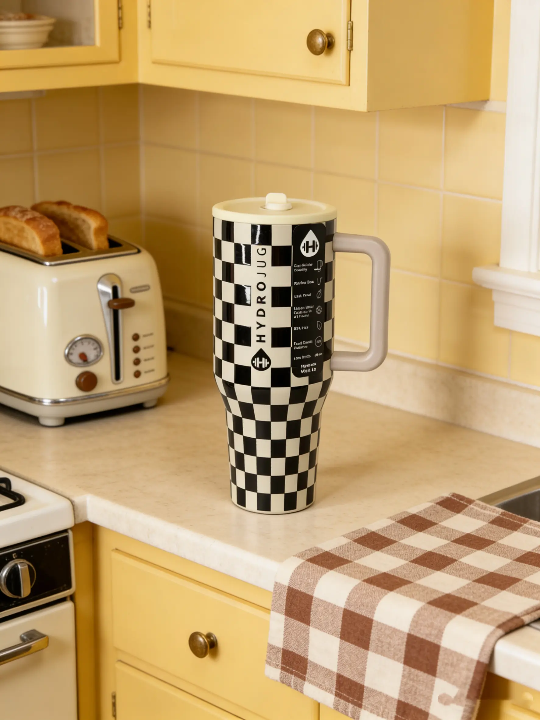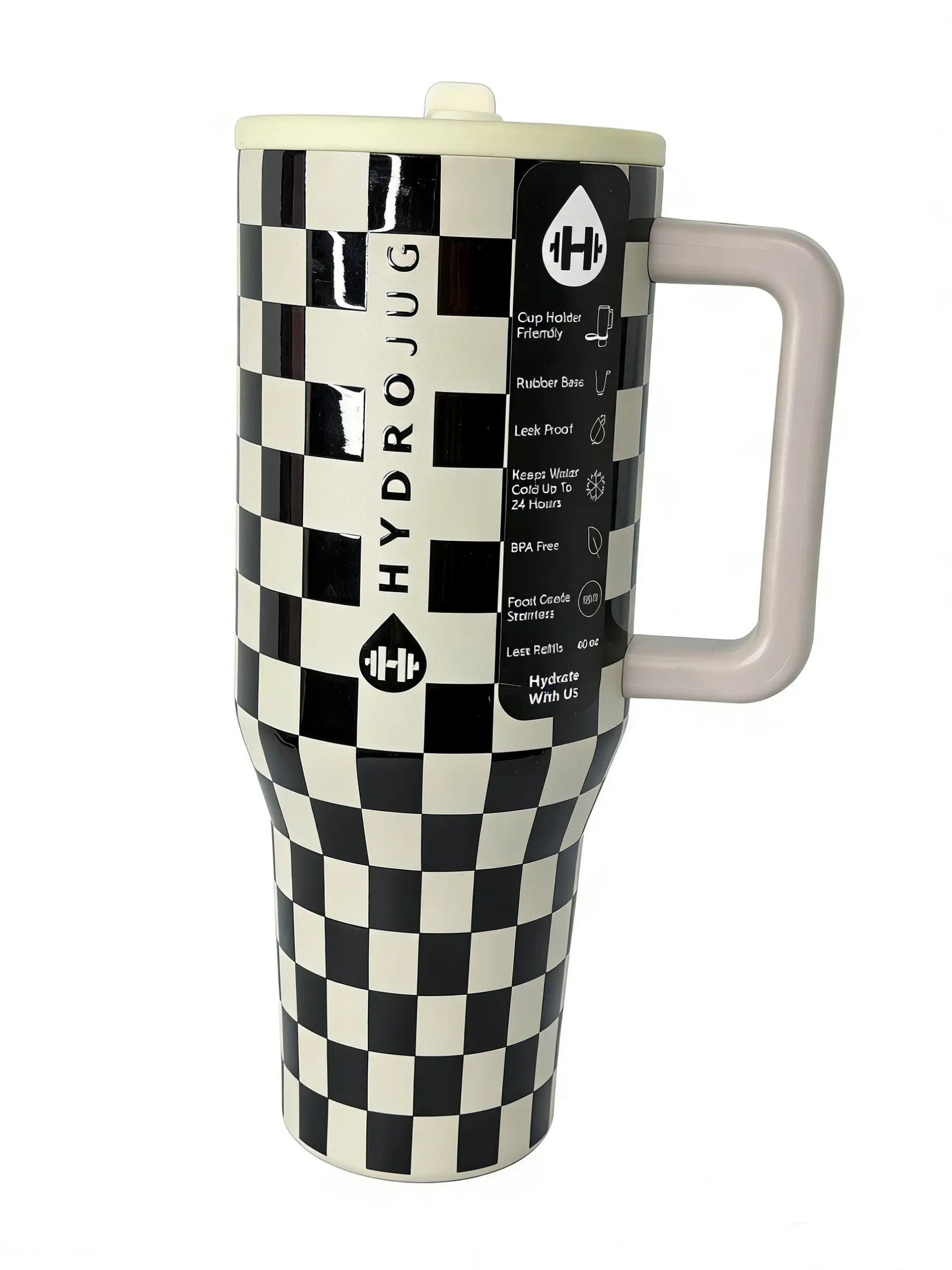 ✨ Upgrade your hydration with the HydroJug Checkerboard Tumbler. This 40oz insulated mug keeps drinks cold for 24 hours. It's leak-proof and BPA-free, ideal for busy lifestyles. The ergonomic handle ensures a comfortable grip. Stay stylish and practical with this lightweight, portable drinkware.