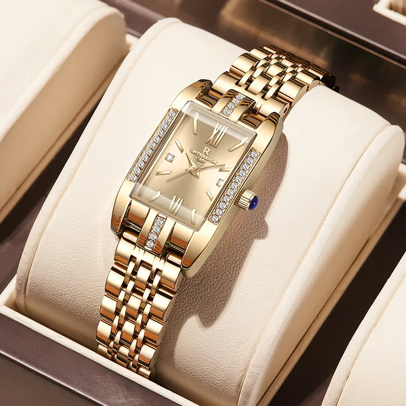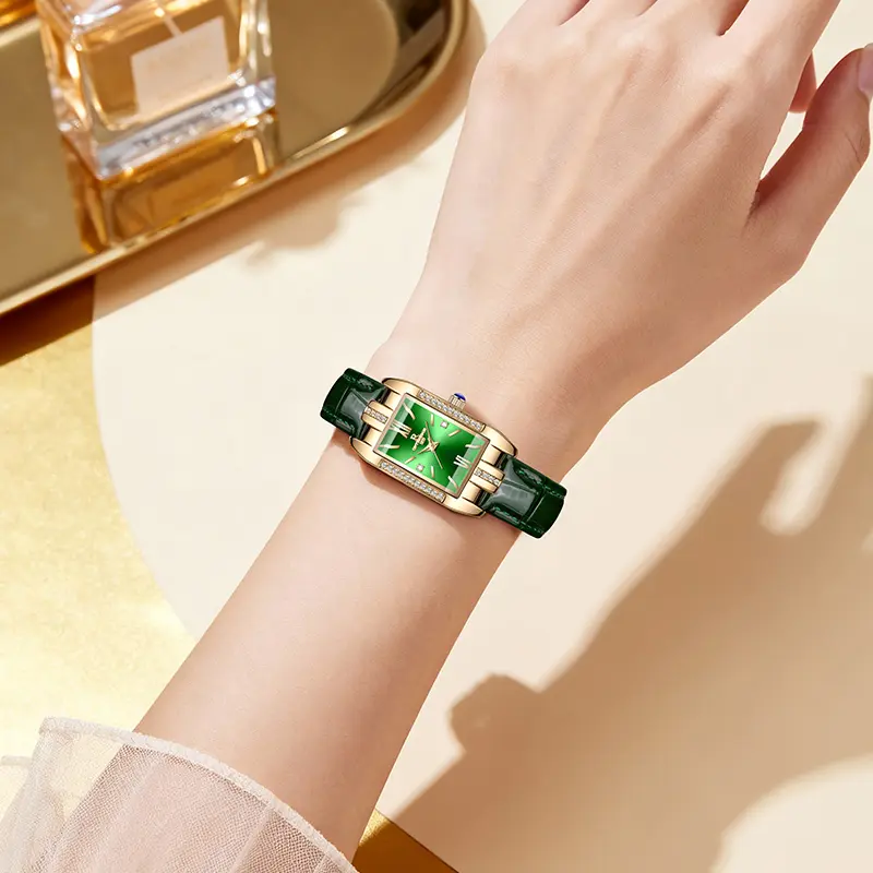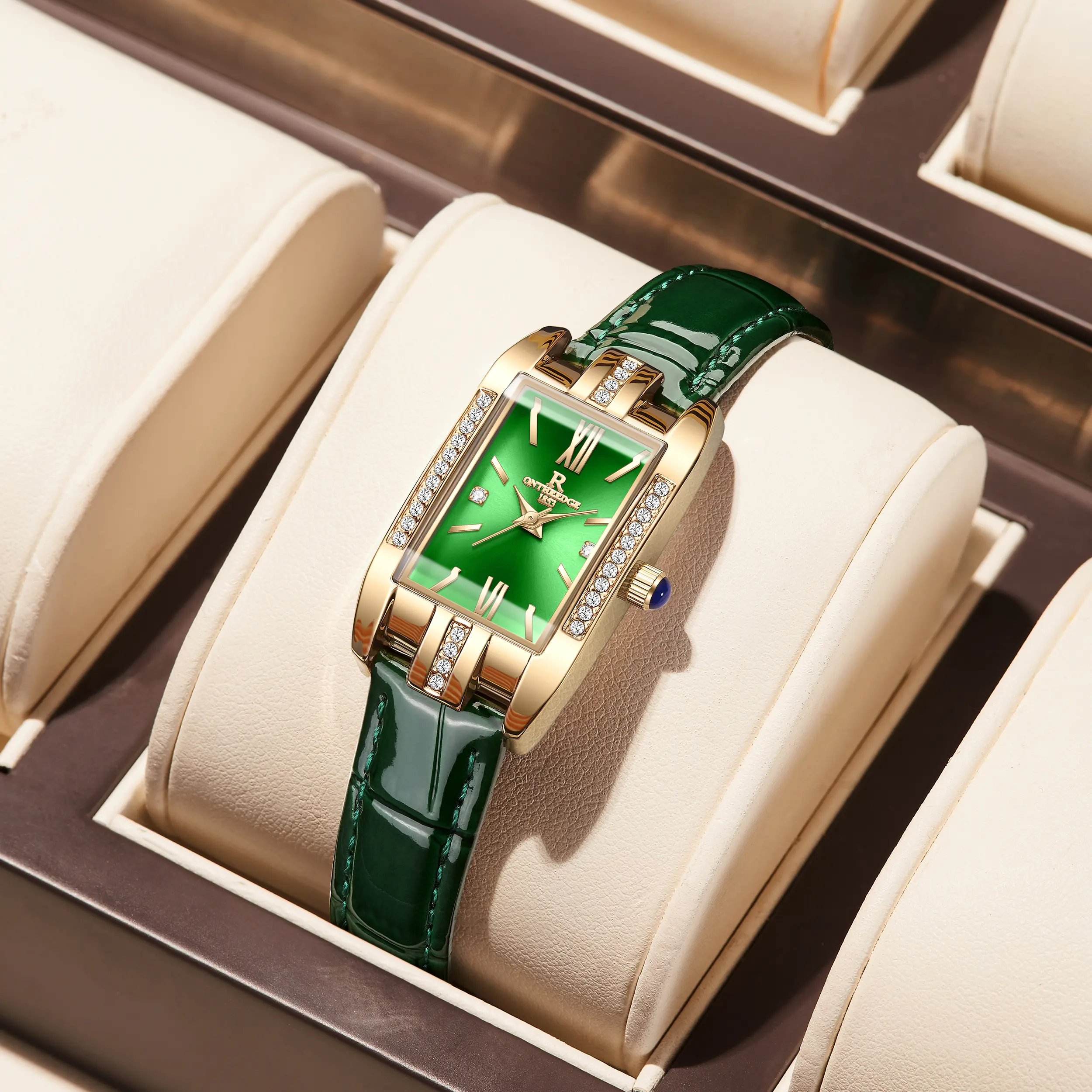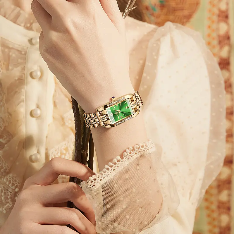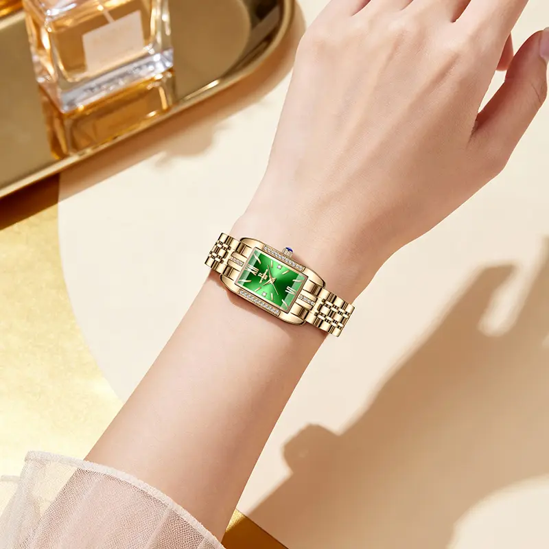 Women's Luxury Gold Rectangle Quartz Watch - Green Dial with Crystal Diamond Accents, Roman Numerals, Stainless Steel Band, Elegant Dress Wristwatch, Perfect Gift for Her
