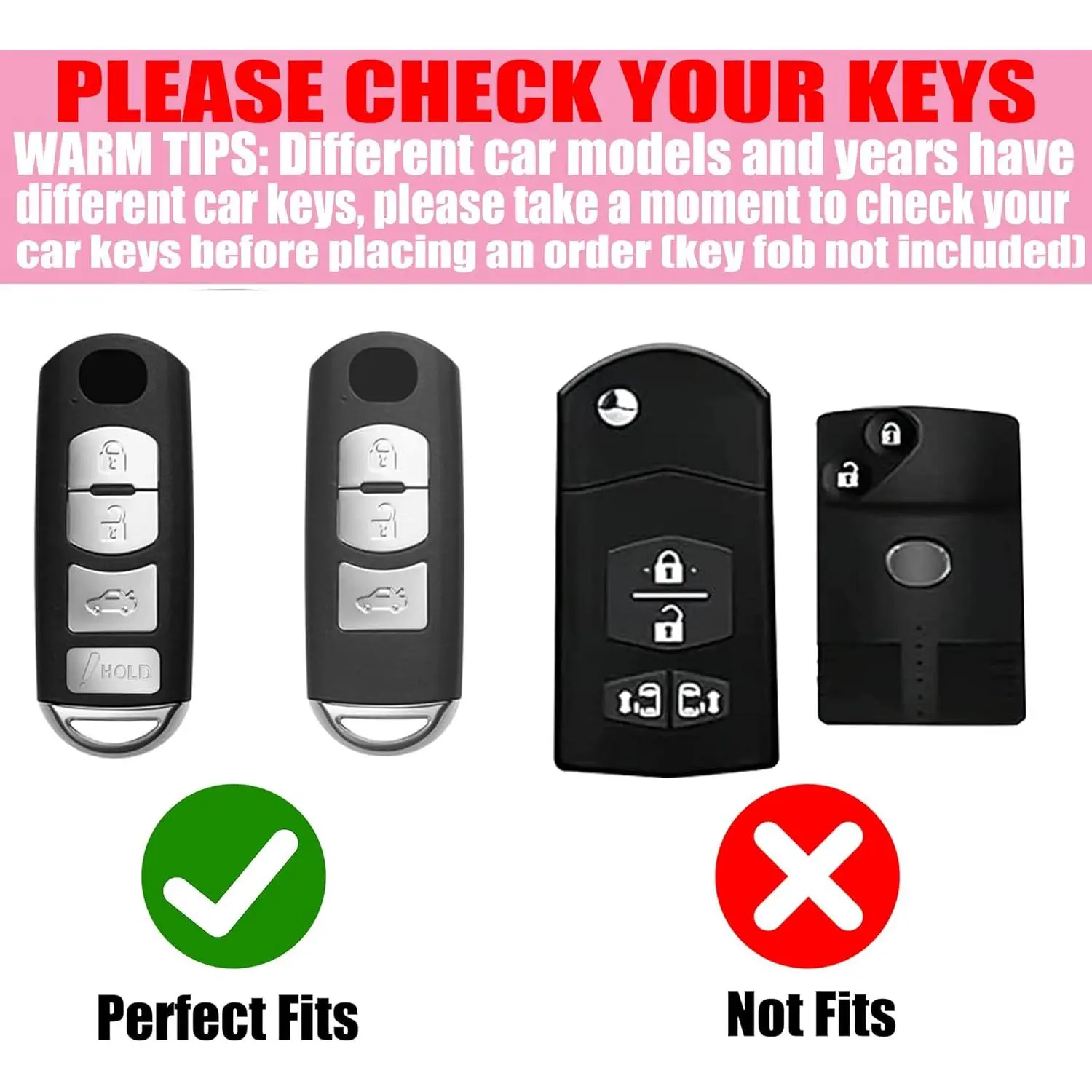 Only compatible with Mazda 3 2014 - 2018, Mazda 6 2014 - 2019, CX-3 2016 - 2020, CX-5 2013 - 2019, CX-9 2010 - 2019, MX-5 Miata 2016 - 2019, MX-5 Miata Grand Touring 2009 - 2015 4 buttons smart keys. The model is only for reference, please DOUBLE CHECK your key shape and button labels carefully to make sure it is the same as the picture.