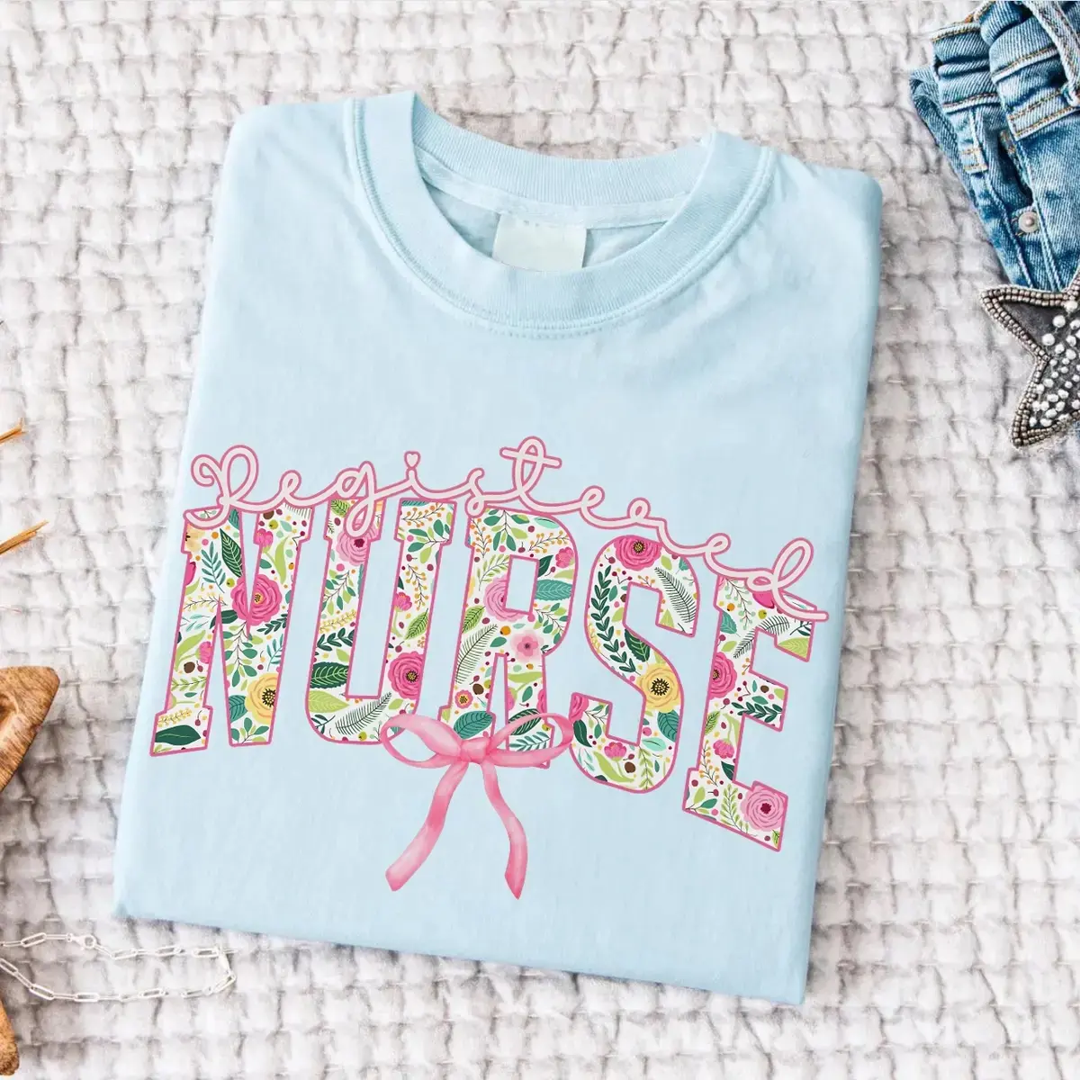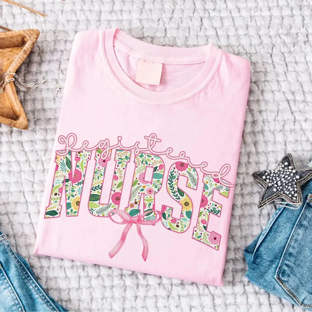 Comfort Colors Floral Registered Nurse Bow T-Shirt - Pink Girly Aesthetic RN Nurse Coquette Tee, Nursing School Graduate Gifts Nurse Week