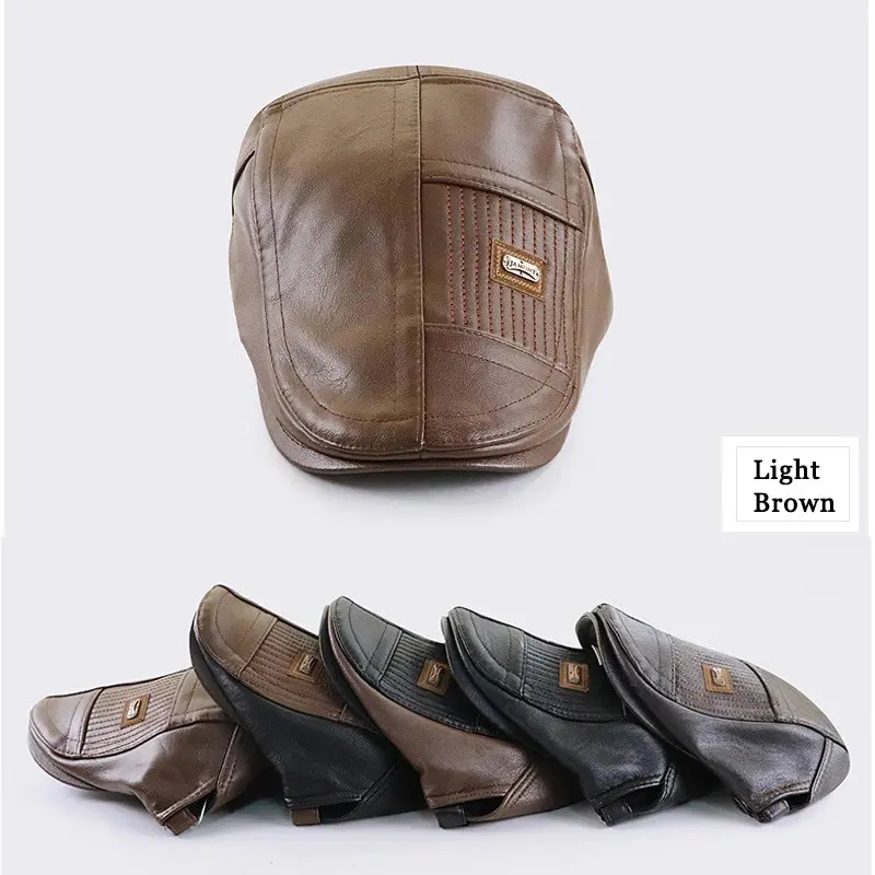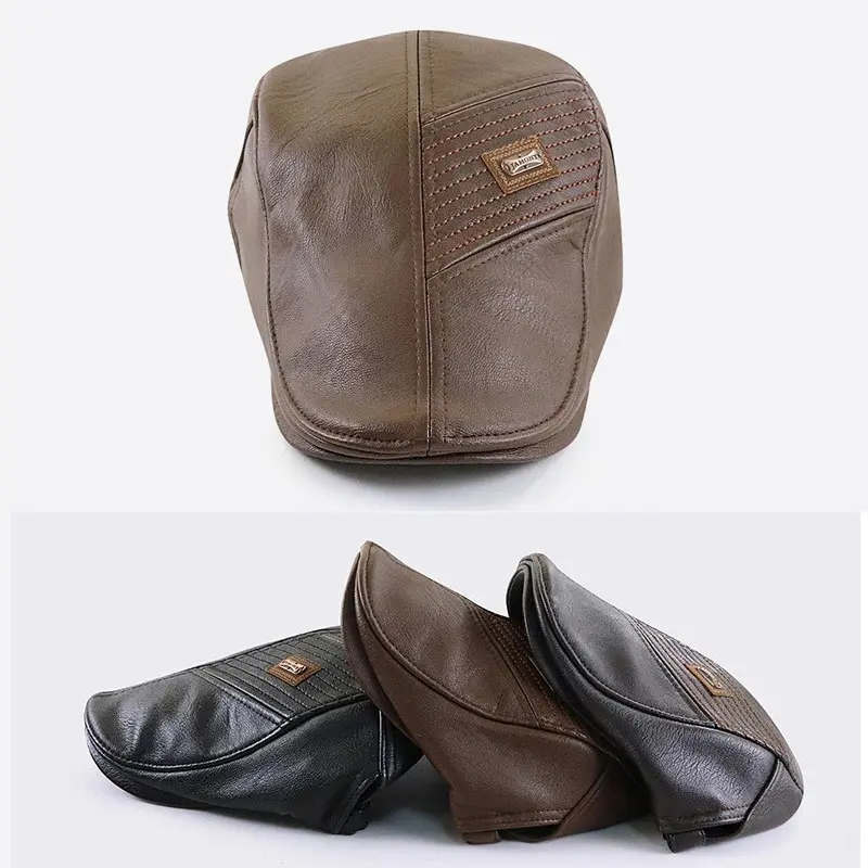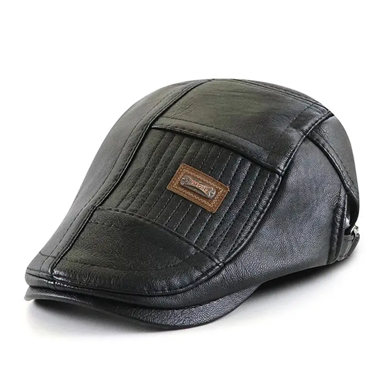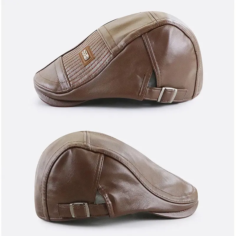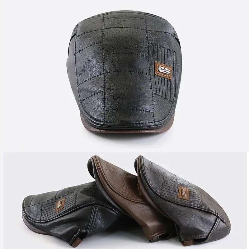 PU Leather Beret Hat Men Autumn Winter Faux Leather Duckbill Newsboy Cap Herringbone Middle-aged Men's Flat Peaked Cap For Dad