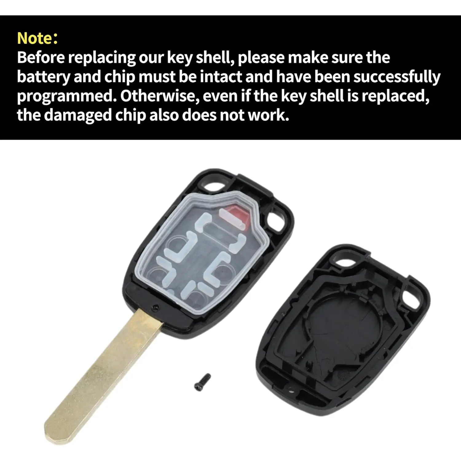 Key Fob Shell Case is constructed with plastic, sturdy and durable. Please make sure the battery and chip must be intact and have been successfully programmed. Otherwise, even if the key shell is replaced, the damaged chip also does not work.