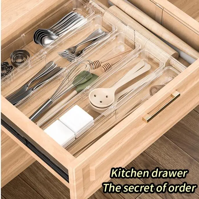 This expandable clear drawer organizer is a versatile addition to your kitchen or vanity. Its transparent design allows you to easily locate items at a glance. Ideal for keeping your space tidy and organized, this tray fits seamlessly into your existing setup.