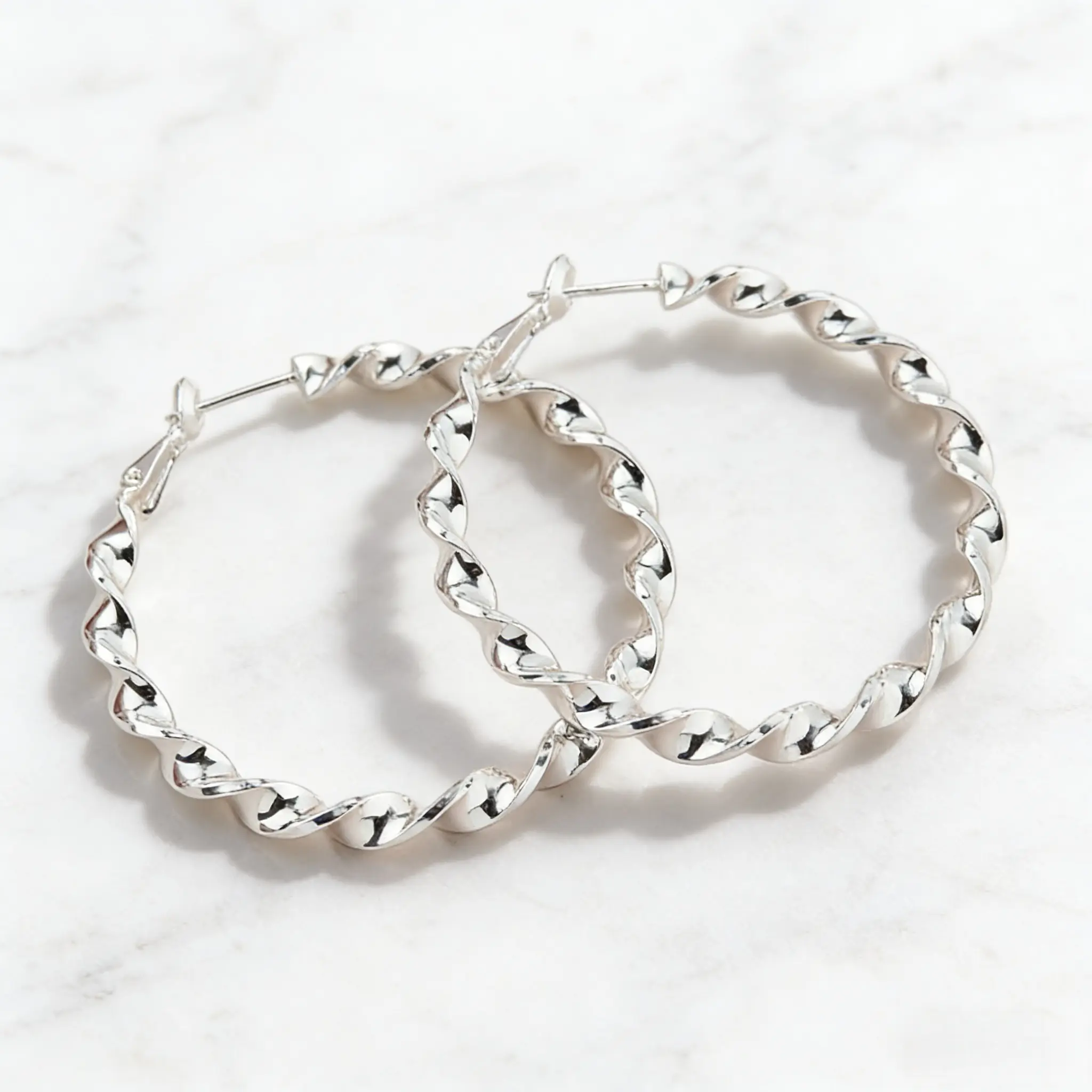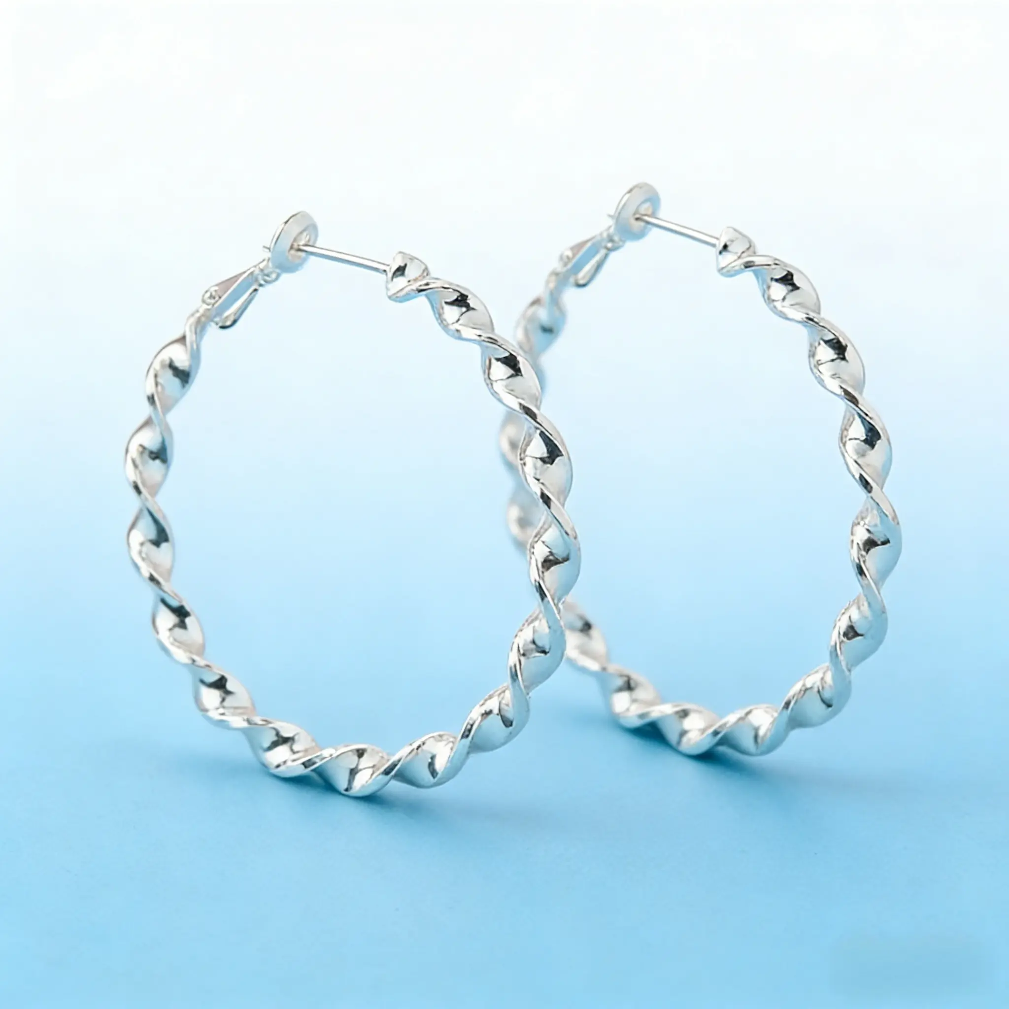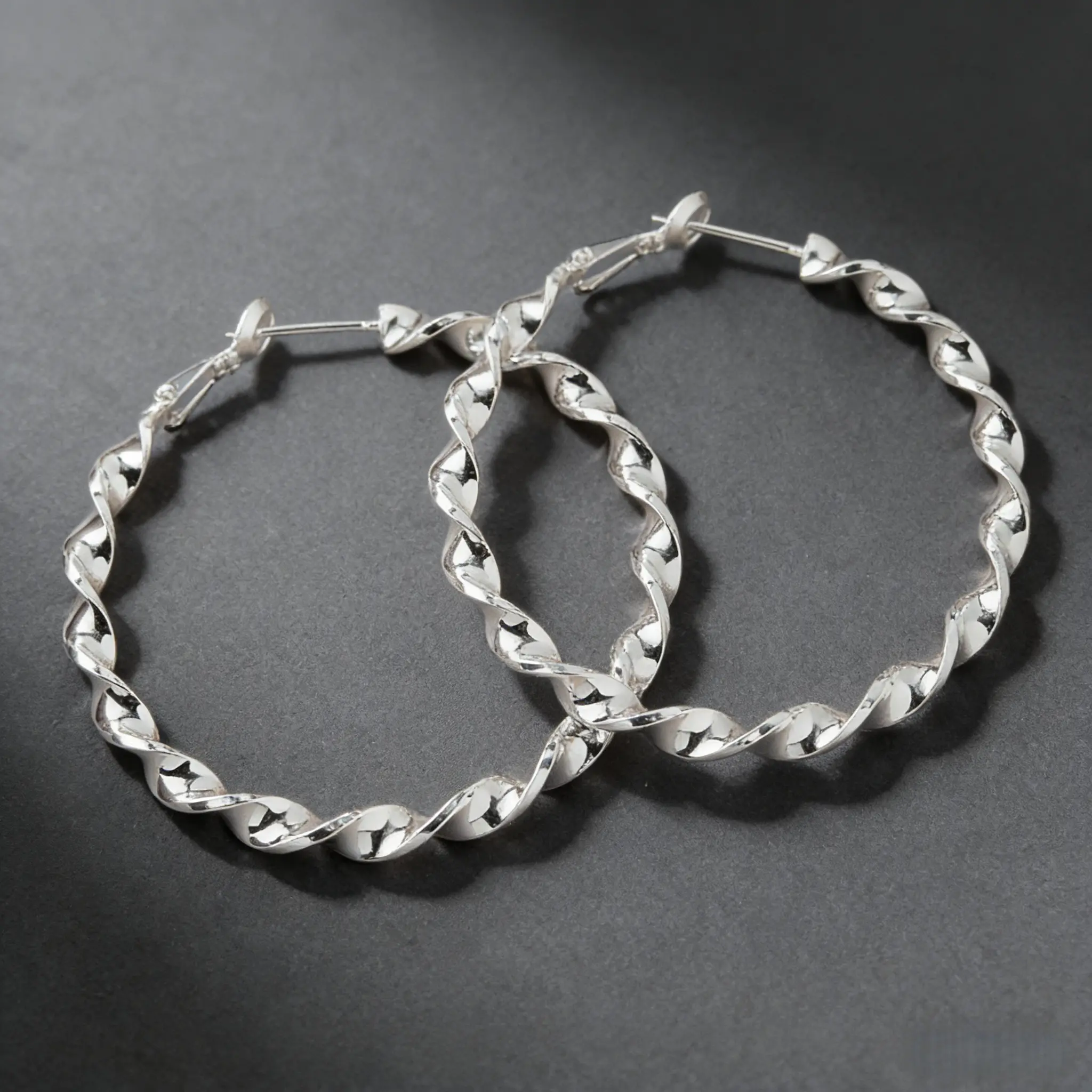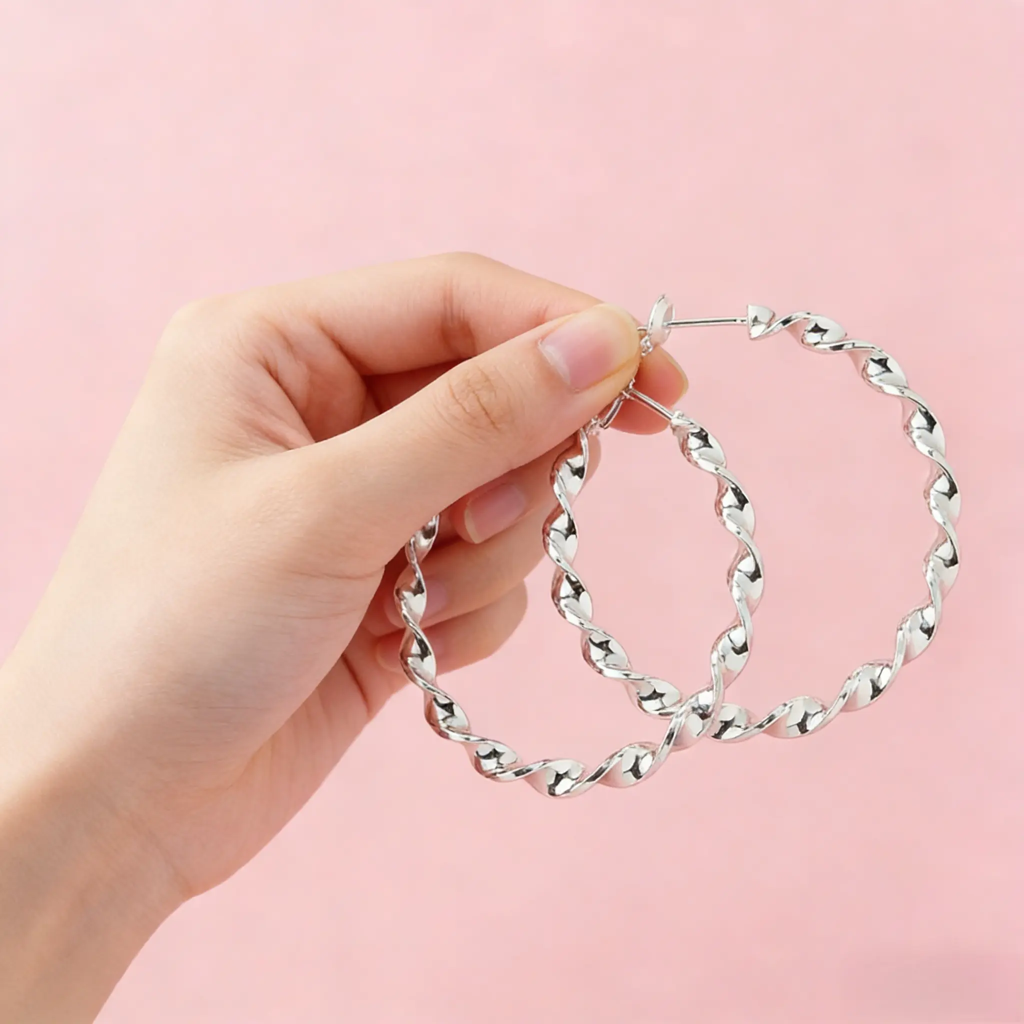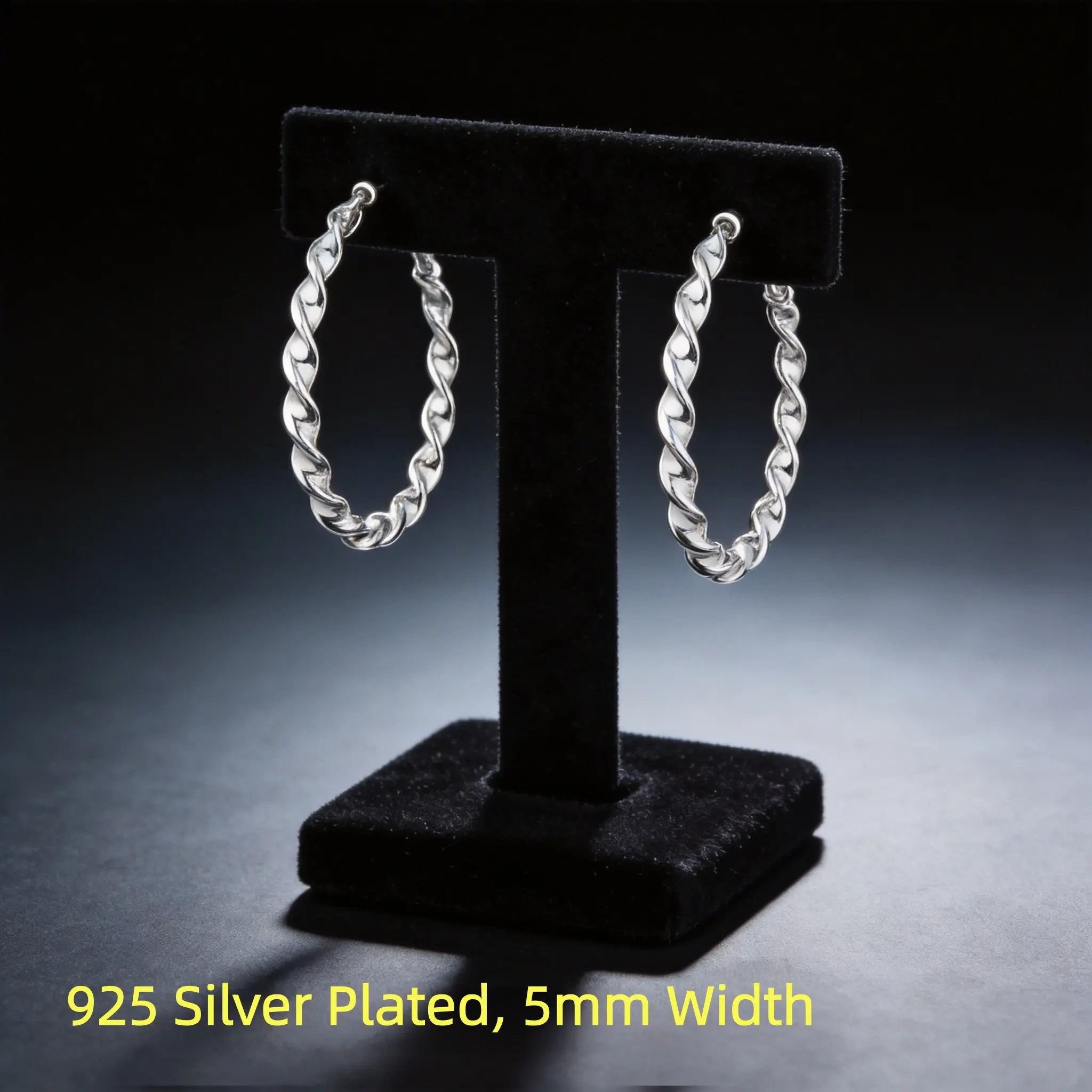 Discover the 925 silver plated twisted hoop earrings! These earrings feature a sleek, twisted texture that catches the light beautifully. The classic large hoop silhouette is a trendy staple, perfect for any occasion. With a 5mm width, they offer a balance of boldness and wearability. Made with high-quality 925 silver plating, they provide a luxurious look at an affordable price.