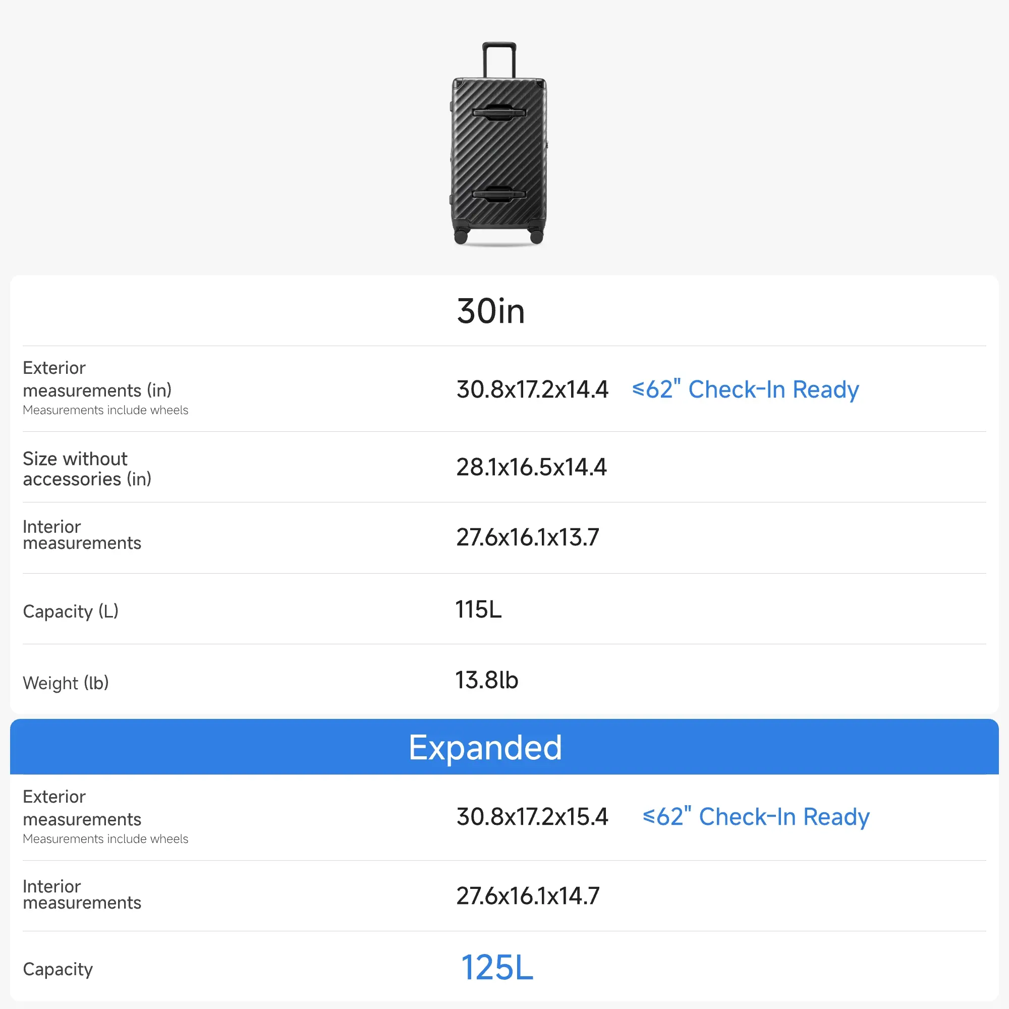 ·Expandable Yet TSA-Approved Size: External dimensions including wheels and handles: 30.8×17.2×14.4in (expanded: 30.8×17.2×15.4 in). Internal dimensions: 27.6×16.1×13.7 in (expanded: 27.6×16.1×14.7 in). Weight: 13.8 lb. Total capacity: 115L (expanded: 125L). Even when expanded, this larged checked luggage stays within standard airline check-in size, offering extra space without extra hassle.