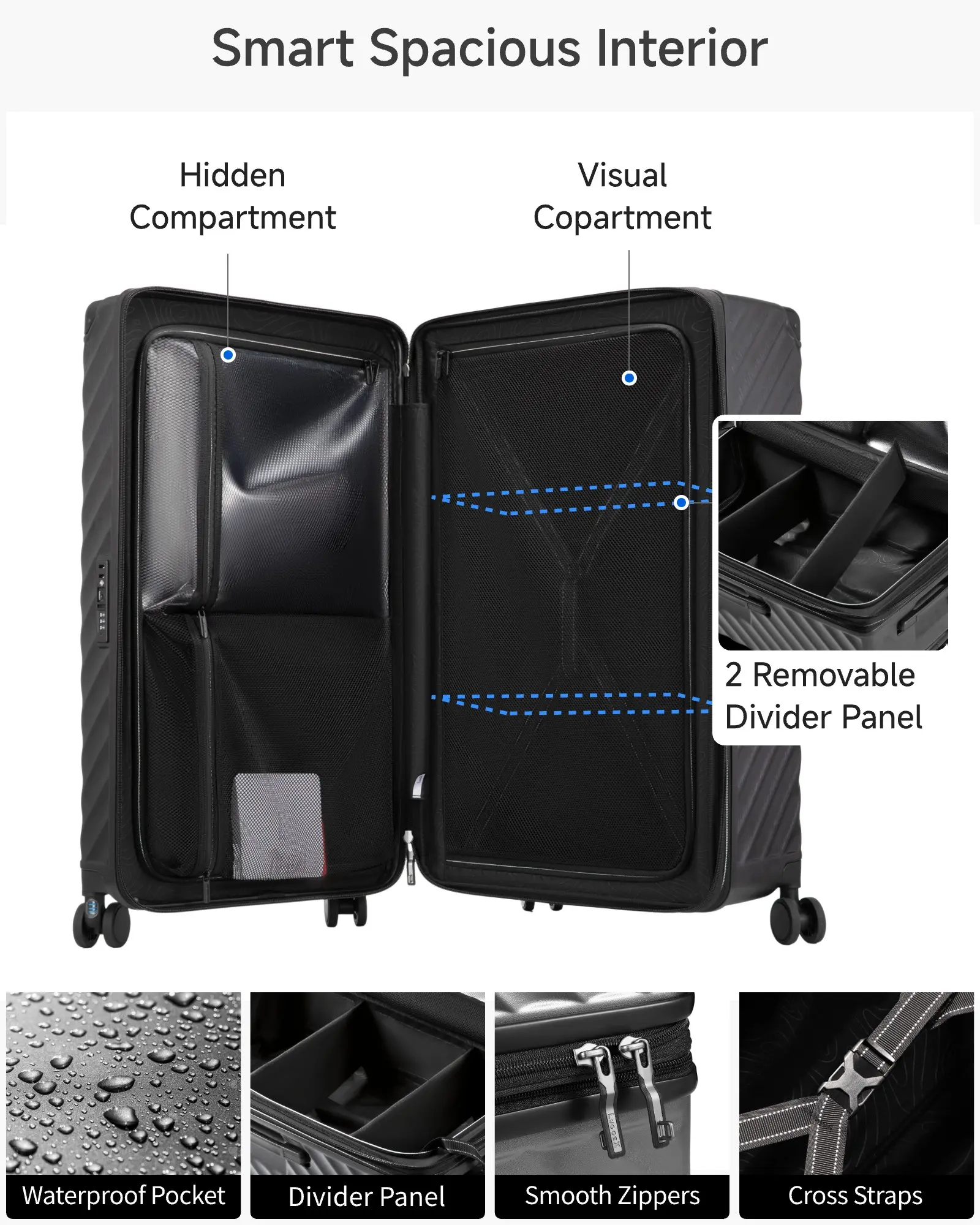 ·Deep Compartment for Bulky Items: 3:7 split trunk suitcase design creates a deep compartment ideal for storing large or irregularly shaped items like boots, down jackets, or helmets. Perfect for family trips, long vacations, or international travel where versatile packing is essential.