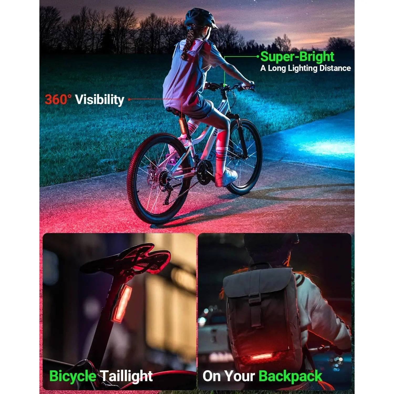 Super Bright & Multi-Mode Safety: Features 2 high-lumen LEDs for crystal-clear night visibility, plus 6 front and 4 rear light modes (including strobe and breathing modes) to ensure safety in all riding conditions.