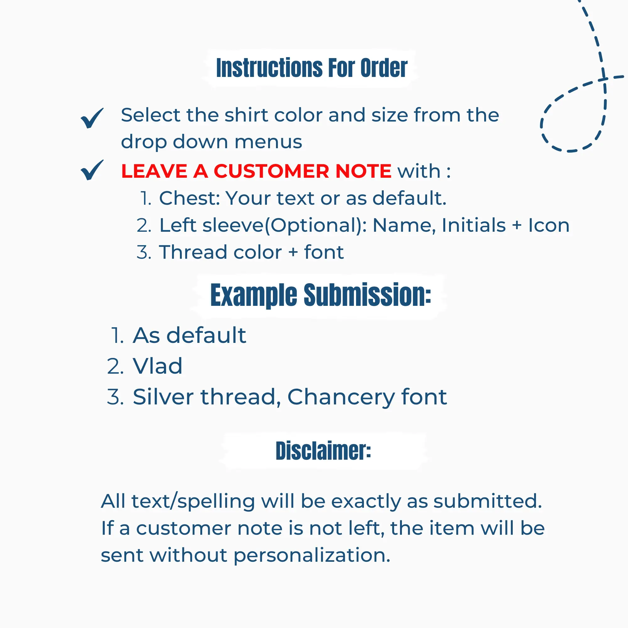 To personalize your order, please leave the following in the "Order Note" at checkout: