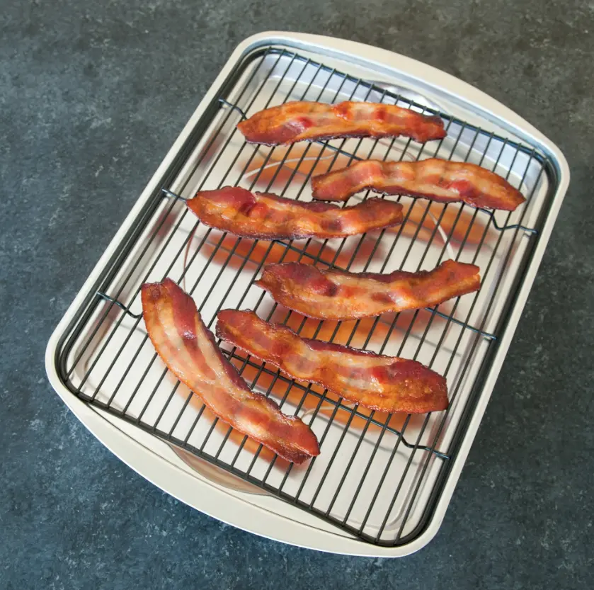The best possible method to make oven-baked bacon! Bakes flat and evenly cooked bacon without the mess! The grease drains away for healthier cooking, and hot air circulates underneath so there's no need for turning. This pan is also great for making jerky, dried fruits, crisp fries, tots, wings, veggies, and more! The pan's four corners act as pouring spouts for easy disposal of bacon fat when cooking is done. Better yet, line the pan with aluminum foil or parchment prior to baking for hassle-free cleanup.
