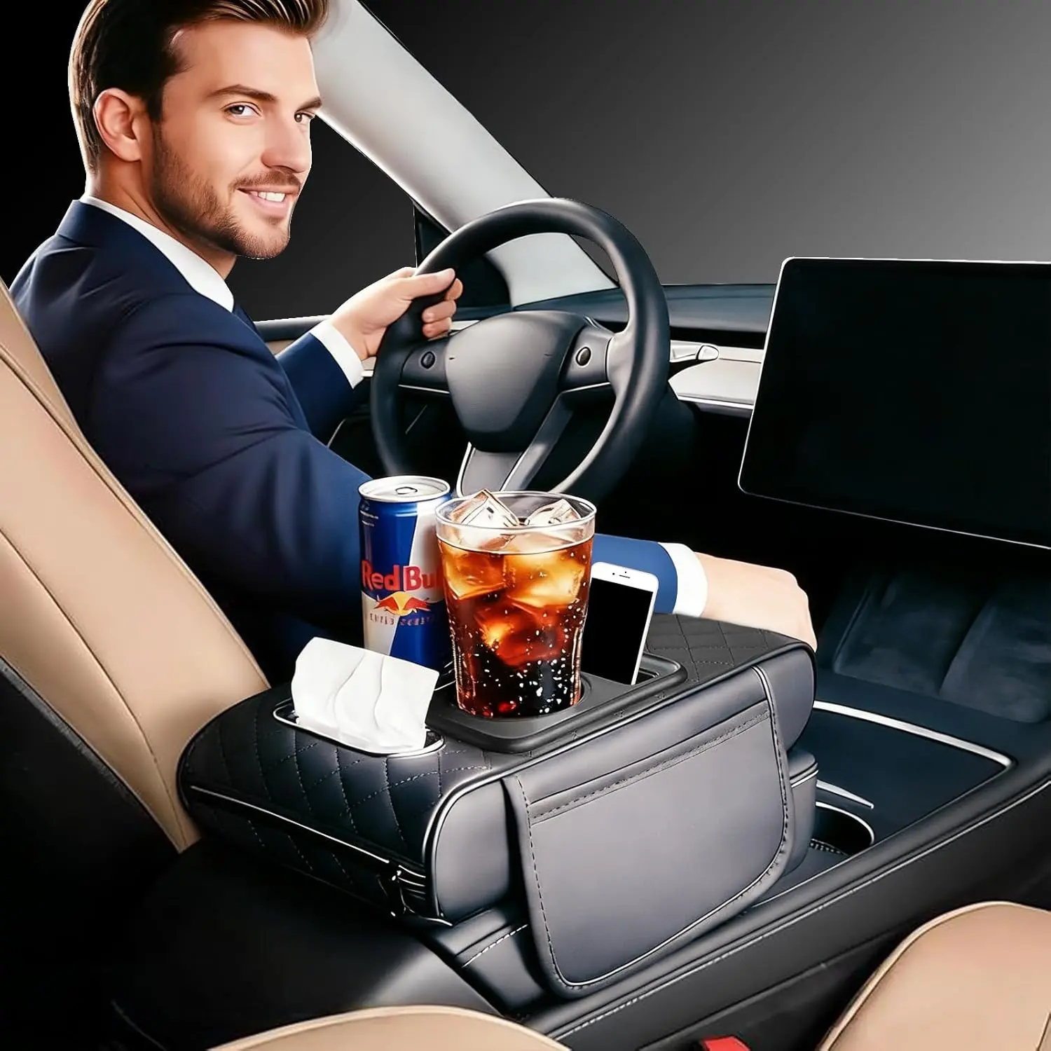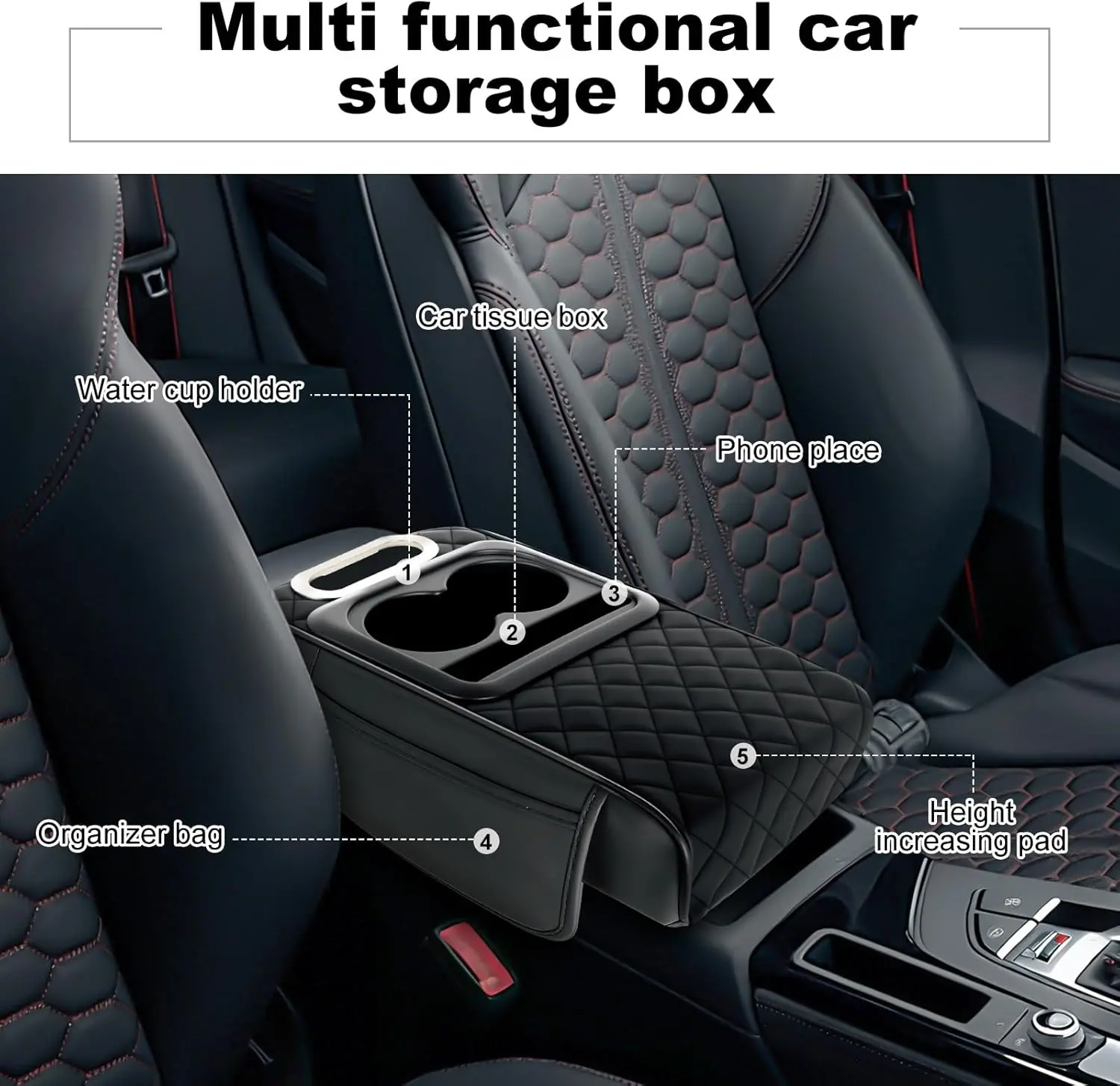 5. 【FREE SHIPPING】Multifunctional PU Leather Car Armrest Box Mat with Central Elbow Heightening Pad Storage Box Cup Holder & Car Tissue Box Auto Interior Accessories