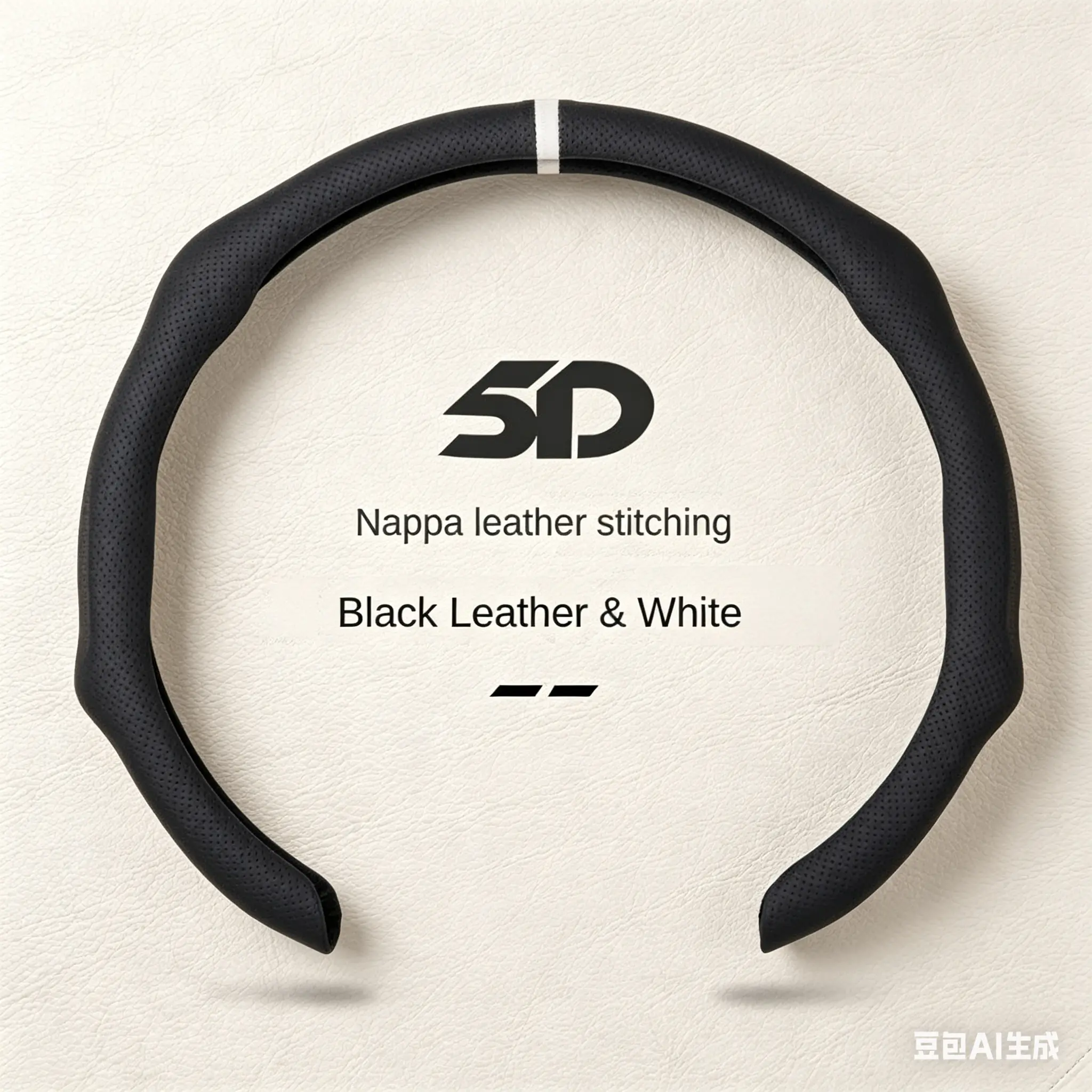 Universal Fit Auto Interior Kit, All-Season Car Steering Wheel Cover, Nappa Leather Black with White Stitching, Ultra-Thin, Anti-Slip, Breathable, Quick Spin