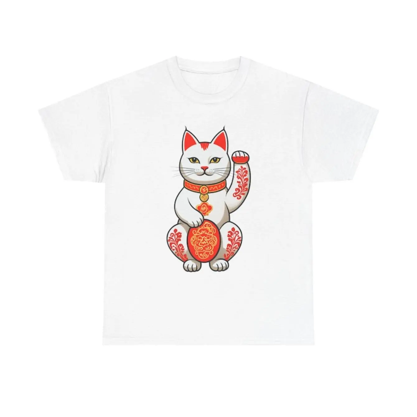 Women's Lucky Cat (Maneki-neko) symbolizing good fortune and prosperity Graphic T-Shirt - Short Sleeve Crew Neck Regular Fit Casual Wear | Soft & Breathable Fabric, Durable Print, Everyday Comfort, Machine Washable, cartoon illustration with traditional