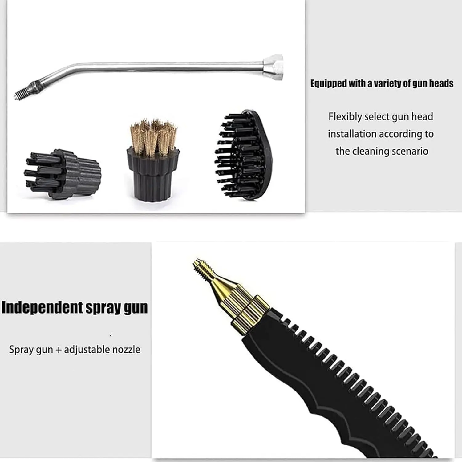 Package Included- The handheld steamer for cleaning includes 1* steam cleaner machine; 1* power cord; 1* extension tube; 2* spare rings, 1* nozzle, 1* copper brush, 1* plastic brush, 1* round brush.