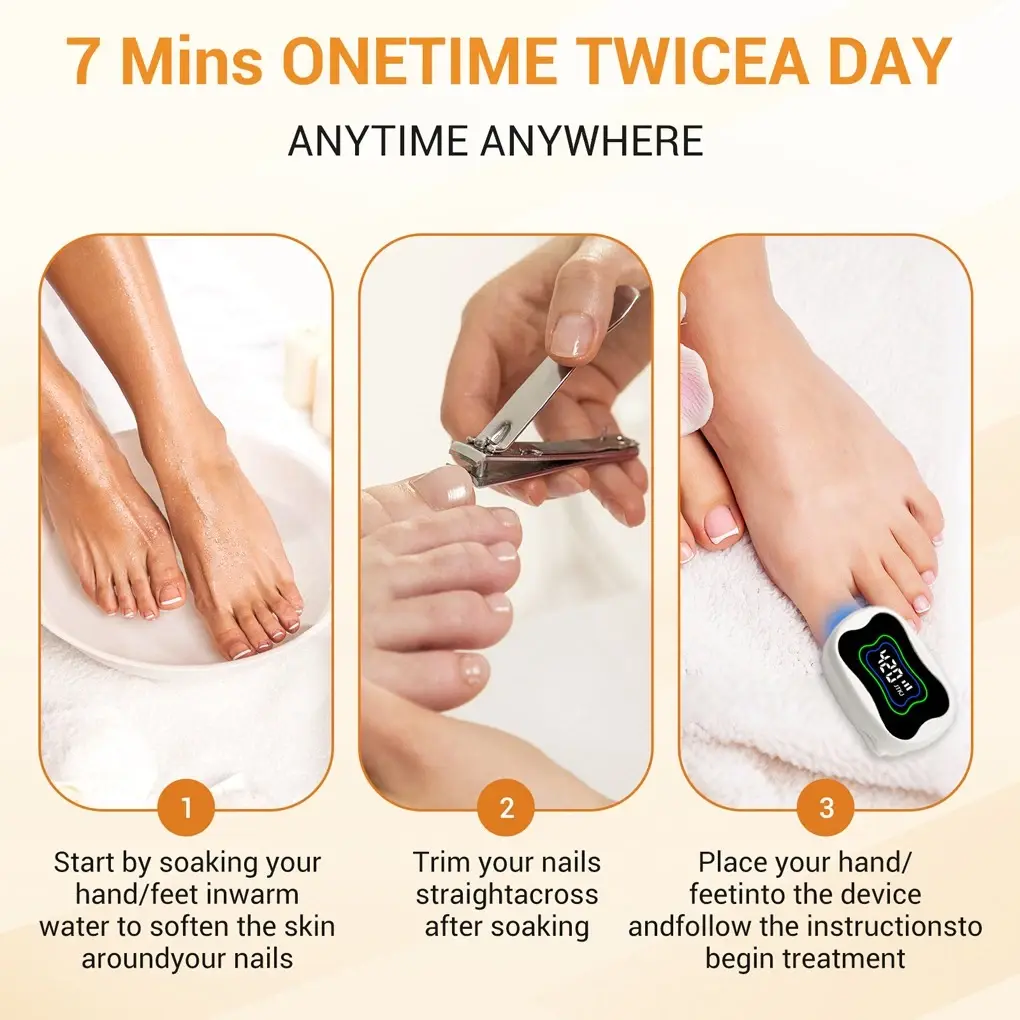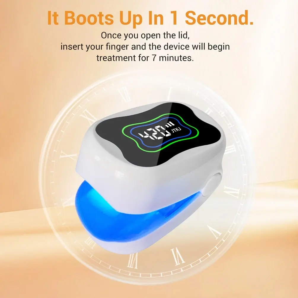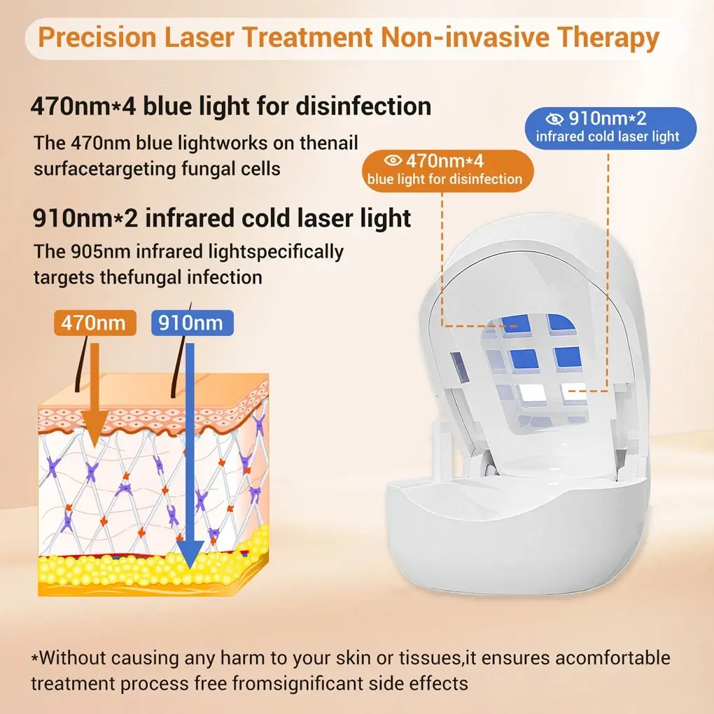 Experience professional-grade laser nail fungus treatment in the comfort of your home! This advanced dual-light therapy device combines 910nm infrared and 470nm blue light wavelengths to effectively target nail fungus from surface to deep tissue layers—promoting fast healing, disinfection, and regeneration without pain or chemicals.