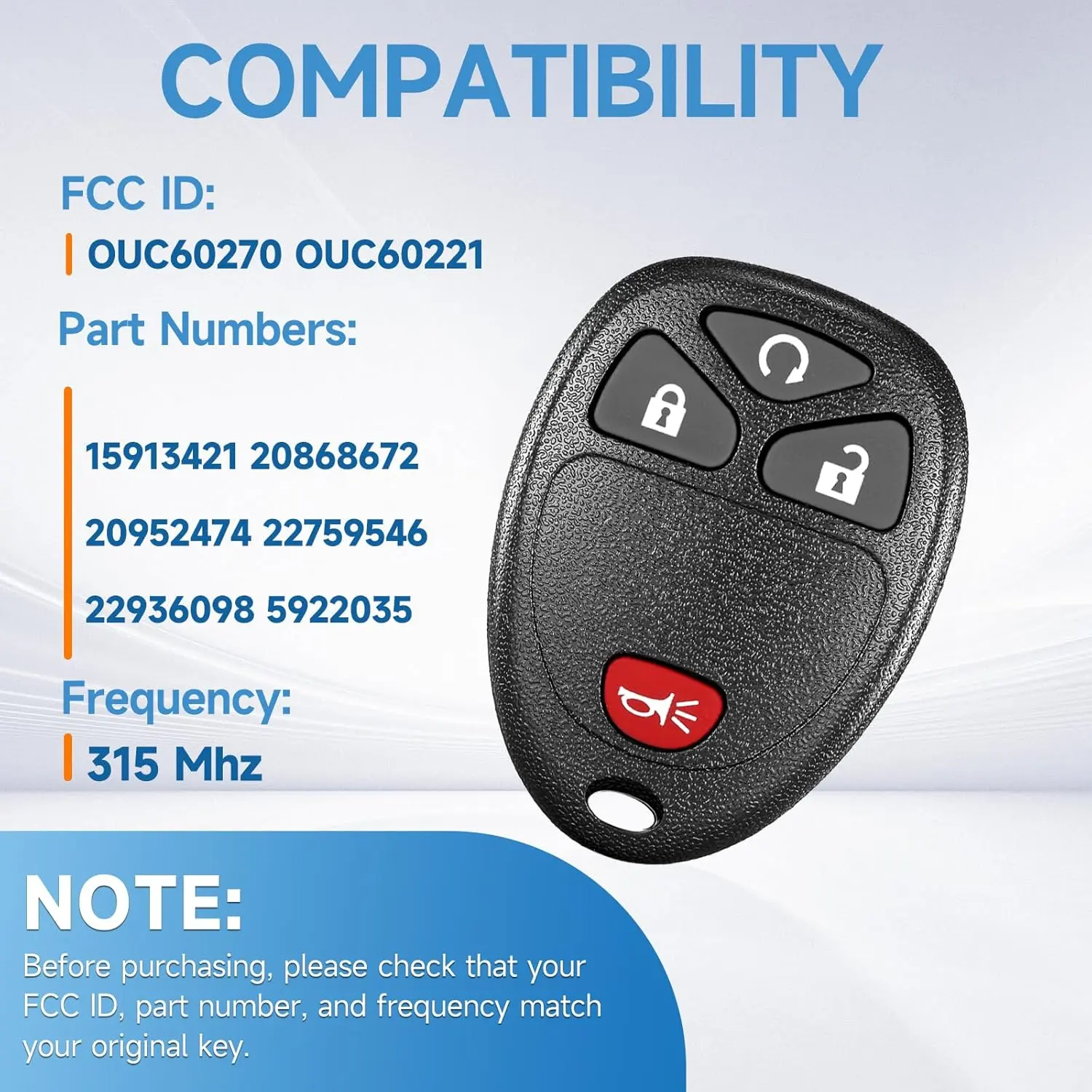 This key fob replacement is designed for Chevy Silverado, Avalanche, Equinox, Express, Traverse, GMC Yukon, Sierra, Acadia, and Cadillac Escalade. It fits models from 2007 to 2013. Compatible with Tahoe, Suburban, and Impala. Ensure your keyless entry remote works seamlessly with your vehicle.